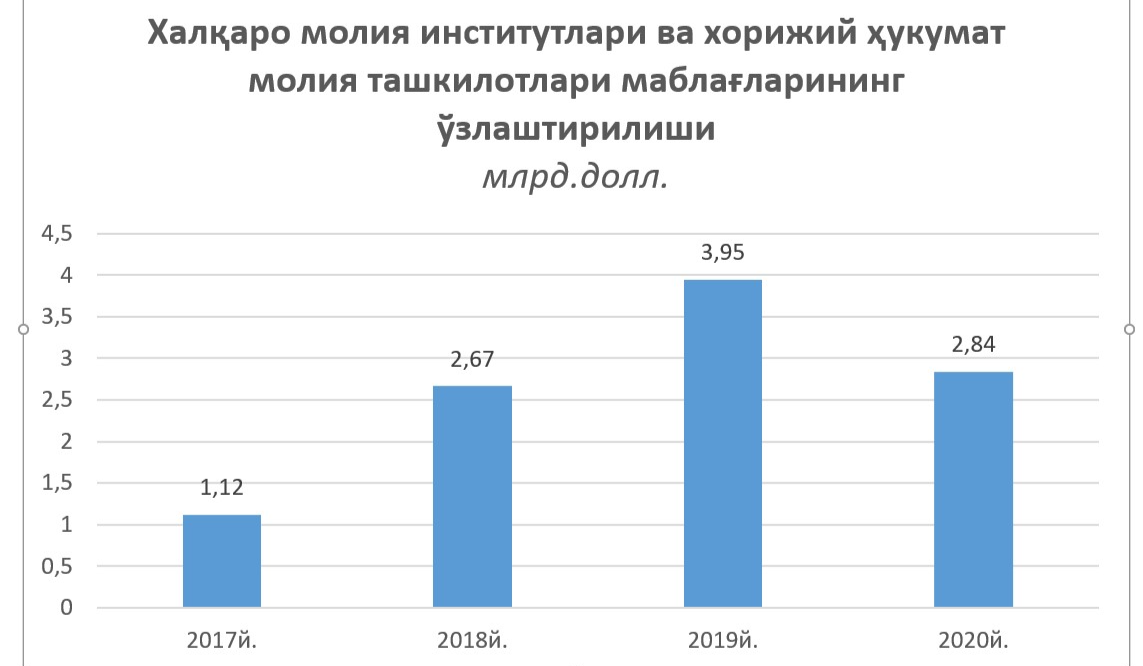 Xususan, 2017-2020 yillarda xalqaro moliya institutlari va xorijiy hukumat moliya tashkilotlari ishtirokidagi 327 ta investitsiya loyihalari doirasida 10,26 mlrd. dollar kredit mablag'lari o'zlashtirilib, qator sohalarni rivojlantirishga yo'naltirildi. Jumladan, mablag'lar yoqilg'i-energetika sanoatiga (5,88 mlrd. dollar); kommunikatsiya va mudofaa sanoatiga (1,56 mlrd. dollar); qishloq va suv xo'jaliklari tizimiga (1,27 mlrd. dollar); moliyalashtirish yo'nalishiga (0,95 mlrd. dollar); ijtimoiy sohalarga (0,47 mlrd. dollar) va boshqa tarmoqlarga yo'naltirildi.