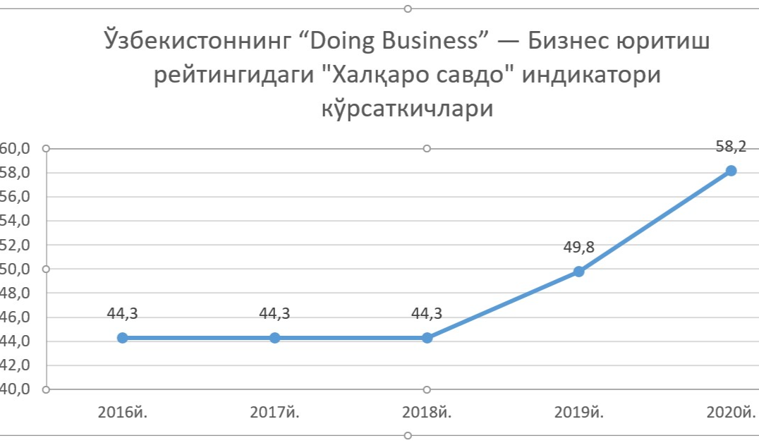 Natijada, O'zbekistonning “Doing Business” — Biznes yuritish reytingidagi "xalqaro savdo" indikatori ko'rsatkichlari 2016 yildagi 44,3 balldan 2020 yilda 58,2 ballga yaxshilanishiga erishildi.