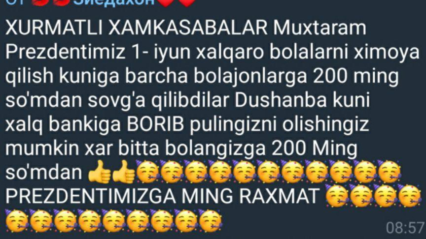 Bank filiallari oldida toʻplanishga hojat yoʻq. Moddiy yordam pullari belgilangan grafikka koʻra hududlarda tarqatiladi yoki plastik kartalarga tushirib beriladi.