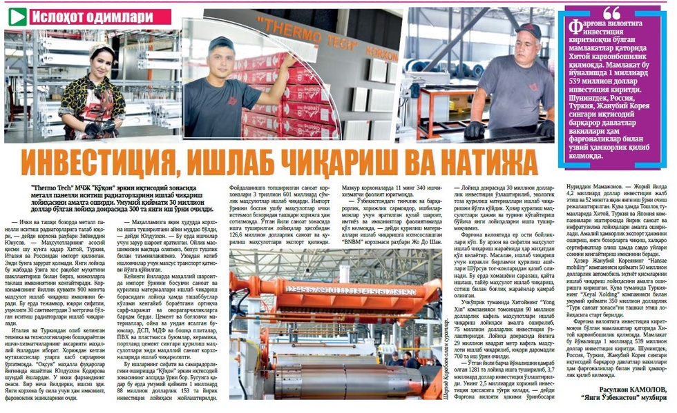— Oʻtgan yili barcha yoʻnalishni qamrab olgan 1281 ta loyiha ishga tushirilib, 3,7 milliard dollar investitsiya oʻzlashtirildi. Uning 2,5 milliardi xorijiy inves­titsiya hissasiga toʻgʻri keladi, — dey­di Fargʻona viloyati hokimi oʻrinbosari Nuriddin Mamajonov. — Joriy yilda