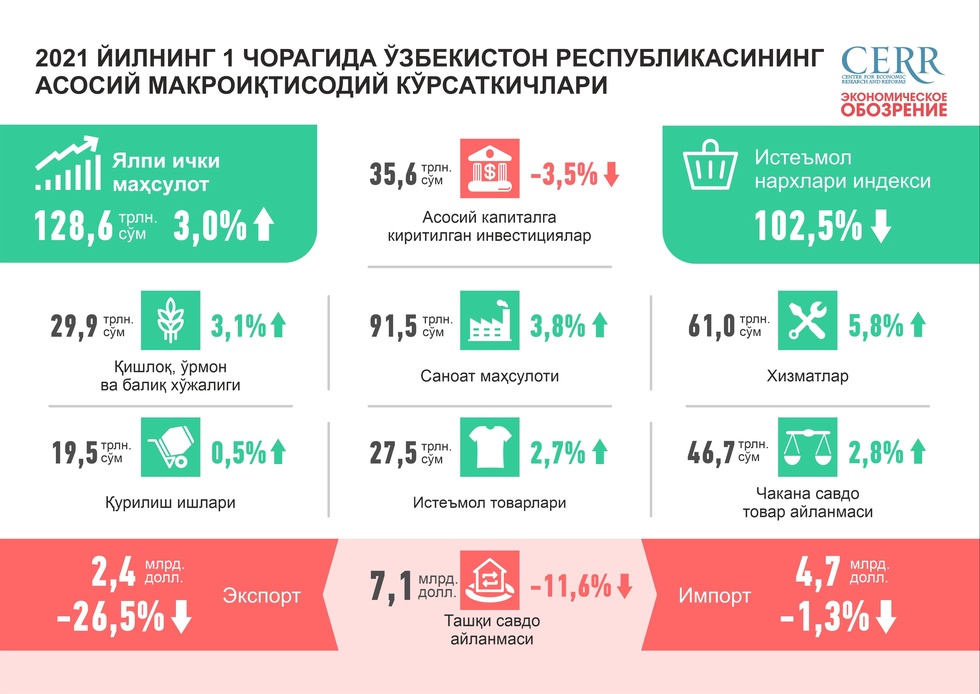 Birinchi chorakning makroiqtisodiy tahlillariga ko'ra, O'zbekiston iqtisodiyoti kuchli o'sish traektoriyasiga qaytmoqda. Iqtisodiyotning barcha tarmoqlarida ishlab chiqarish hajmining o'sishi kuzatildi. Dastlabki uch oyda qishloq, o'rmon va baliq xo'jaligi mahsulotlari ko'rsatkichlari 2020-yil birinchi choragiga nisbatan biroz pastlaganiga qaramay, 3,1 foiz o'sish bilan yakunlandi.