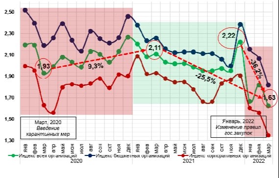 Аuksion samaradorligi indeksi 2021-yil yanvaridan shu yilning martigacha 2,04 dan 1,63 gacha sezilarli darajada pasayishni boshladi. 2021-yilning tegishli davri bilan taqqoslaganda indeks qiymati 25,5 foizga kamaydi va 2021 yil dekabriga nisbatan pasayish 36,2 foizni tashkil etdi, bu asosan muvaffaqiyatli bajarilgan shartnomalar foizining 75% dan 50% gacha pasayishi va davlat xaridlari tizimida yangi qoidalarni joriy etish bilan bogʼliq.
