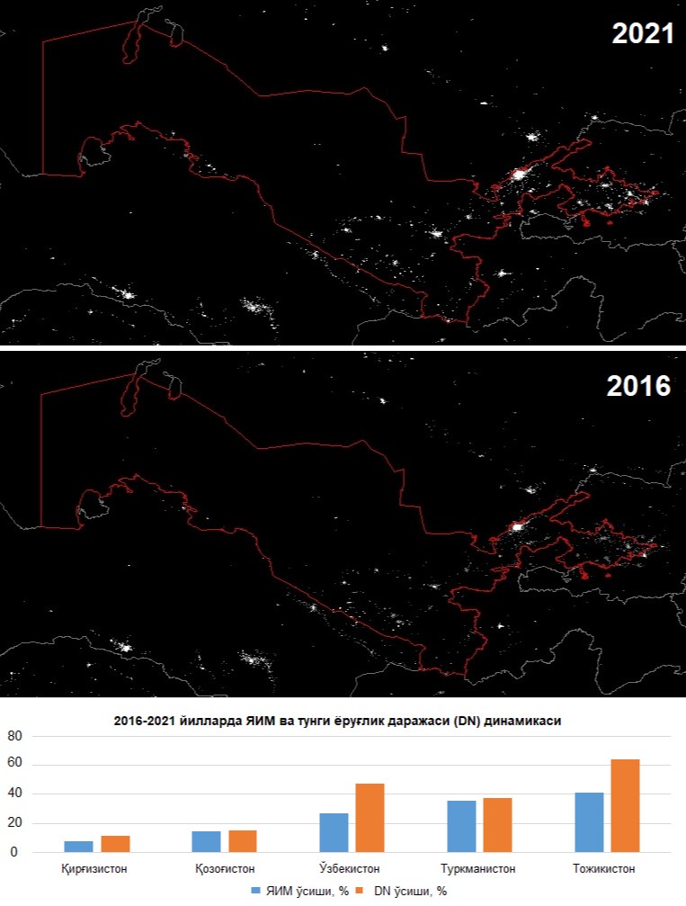 Sunʼiy yoʻldoshdan olingan tungi yorugʻlik tasvirini 63 xil rangda qayta ifodalash natijalari shuni koʻrsatmoqdaki, 2021-yil dekabr oyida tunda yoritilganlik darajasi 2016-yilning mos davridagiga nisbatan Qirgʻizistonda 11,8 foiz, Qozogʻistonda 15,5 foiz, Oʻzbekistonda 47,2 foiz, Turkmanistonda 37,5 foiz va Tojikistonda 64,4 foizga ortgan. Shuningdek, 2021-yilda YAIM 2016-yildagiga qaraganda Qirgʻizistonda 7,8 foiz, Qozogʻistonda 14,9 foiz, Oʻzbekistonda 27,3 foiz, Turkmanistonda 35,2 foiz va Tojikistonda 41,1 foizga ortgan.