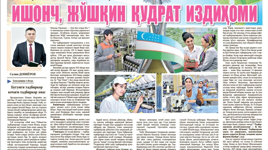Matbuot — jamiyat koʻzgusi. Bugun matbuotimizda dunyo iqtisodiyotidagi dolzarb masalalar asosiy mavzu boʻlib turibdi. Bular “yashil iqtisodiyot”ga jadal oʻtish, sunʼiy intellektni sohada tatbiq etish va undan samarali foydalanish kabi jihatlardir. “Yashil iqtisodiyot” nafaqat tabiatga koʻmak, balki texnik taraqqiyotning belgisi ham hisoblanadi. Chunki zamonaviy texnologiyalarsiz toʻlaligicha “yashil iqtisodiyot”ga oʻtish imkonsiz. Sunʼiy intellekt esa taraqqiyotning eng yuksak choʻqqilaridan biri. Demak, bugun yangi Oʻzbekiston tadbirkorlari tafakkuri, orzu intilishlari xalqaro miqyosdagi koʻlamga chiqqan!