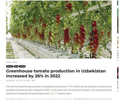 «East Fruit» ekspertlarining O‘zbekiston Qishloq xo‘jaligi vazirligi maʼlumotlariga tayanib maʼlum qilishlaricha, 2022 yilning yanvar-dekabr oylarida O‘zbekiston issiqxonalarida 301 ming tonna qishloq xo‘jaligi mahsulotlari yetishtirilgan bo‘lsa, uning 211 ming tonnasi pomidor mahsuloti hissasiga to‘g‘ri keladi.
