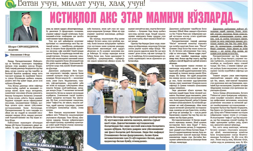 Mustaqil Oʻzbekistonimizning shonli 34 yillik toʻyini nishonlash arafasida ekanmiz, oʻtgan yillarga, bosib oʻtilgan murakkab, ayni paytda sharafli yoʻllarga teran bir nigoh tashlaymiz. Bu nigoh zamirida bugungi kunimizning yorugʻ manzaralaridan cheksiz gʻurur va iftixor tuygʻusi joʻsh uradi. Bu gʻurur, bu koʻtarinkilik oʻz-oʻzidan paydo boʻlgani yoʻq. Uning poydevorida xalqimizning asriy orzu-armonlari, tiklangan qadriyati, bunyodkorlik shijoati va eng muhimi, ana shu ezgu intilishlarni bir maqsad sari birlashtira olgan, millatning dardini oʻz dardi deb bilib, uni ulugʻ ishlarga safarbar etgan davlatimiz rahbarining qatʼiy irodasi va fidokorona mehnati mujassam.