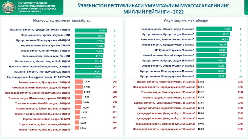 Umumiy o‘rta maktablar reytingida yuqori TOP-10 likdan Navoiy viloyati Navoiy shahri 13-maktab, Buxoro viloyati Buxoro shahri 38-maktab, Buxoro viloyati Buxoro tumani 49-maktab, Buxoro viloyati Jondor tumani 3-maktab, Qoraqalpog‘iston Respublikasi Qonliko‘l tumani 21-maktab, Navoiy viloyati Navoiy shahri 9-maktab, Buxoro viloyati Buxoro shahri 28-maktab, Buxoro viloyati Buxoro tumani 14-maktab, Buxoro viloyati Jondor tumani 41-, 38-maktablar o‘rin oldi.