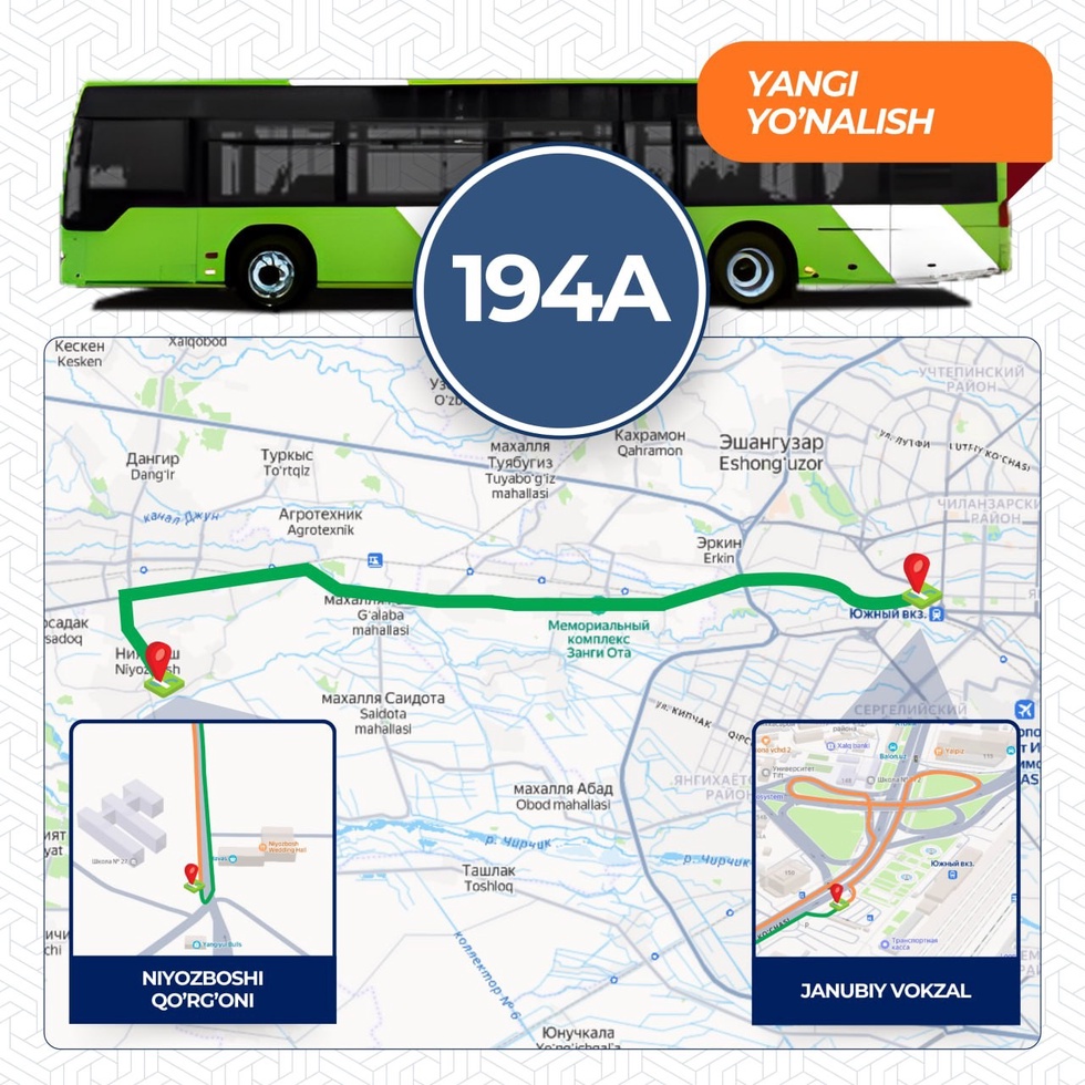 Yangi yoʻnalish Toshkent shahri “Janubiy vokzal” bekatidan Toshkent viloyati “Niyozboshi mahallasi” bekatigacha harakatlanadi. Yoʻnalishda Mercedes-Benz LF avtobuslari xizmat koʻrsatadi.