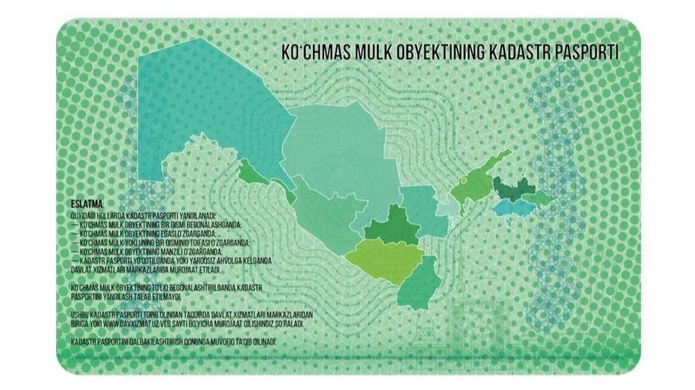 Qogʻoz shaklidagi kadastr pasporti Davlat xizmatlari markazi yoki YAIDXP orqali, plastik shakldagi kadastr pasporti faqat Davlat xizmatlari markazlari orqali taqdim etiladi, deb xabar beradi Adliya vazirligi matbuot xizmati.