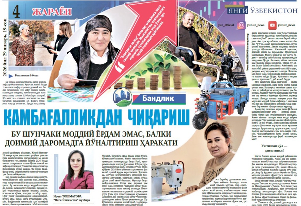 Bu borada mamlakatimizda qator aniq vazifalar belgilangan. Xususan, joriy yilda 1 million nafar aholini doimiy ish bilan taʼminlash, 181 ming oilani kambagʻallikdan chiqarish, kambagʻallikdan xoli mahallalar sonini 2,5 barobarga oshirib, 3,5 mingtaga yetkazish, ishsizlik va kambagʻallik darajasini 4,5 foizga tushirish maqsad qilingan. Bunda mahallalar asosiy drayverga aylanadi. Joriy yilning 23-yanvar kuni davlatimiz rahbari raisligida kambagʻallikni qisqartirish va aholi bandligini taʼminlash boʻyicha 2026-yilda amalga oshirilishi lozim boʻlgan asosiy vazifalar yuzasidan oʻtkazilgan videoselektor yigʻilishida shular haqida soʻz bordi. Vazifalar aniq, ularni amalga oshirish choralari ham belgilab berilgan.