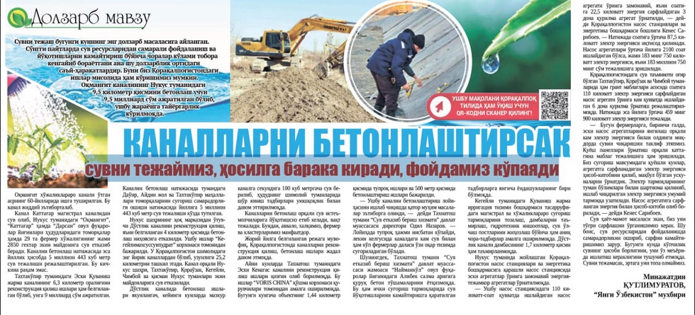 — Ushbu kanalni betonlashtirish loyihasini ishlab chiqishda qator muhim masalalar eʼtiborga olindi, — deydi Taxiatosh tumani “Suv yetkazib berish xizmati” davlat muassasasi direktori Odil Nazarov. — Loyihada tuproq hajmi nisbatan koʻpaydi, lekin kelgusida kanaldagi kam suv bilan ham koʻp fermerlar dalasi oʻzi oqar tizimda sugʻoriladigan boʻladi.