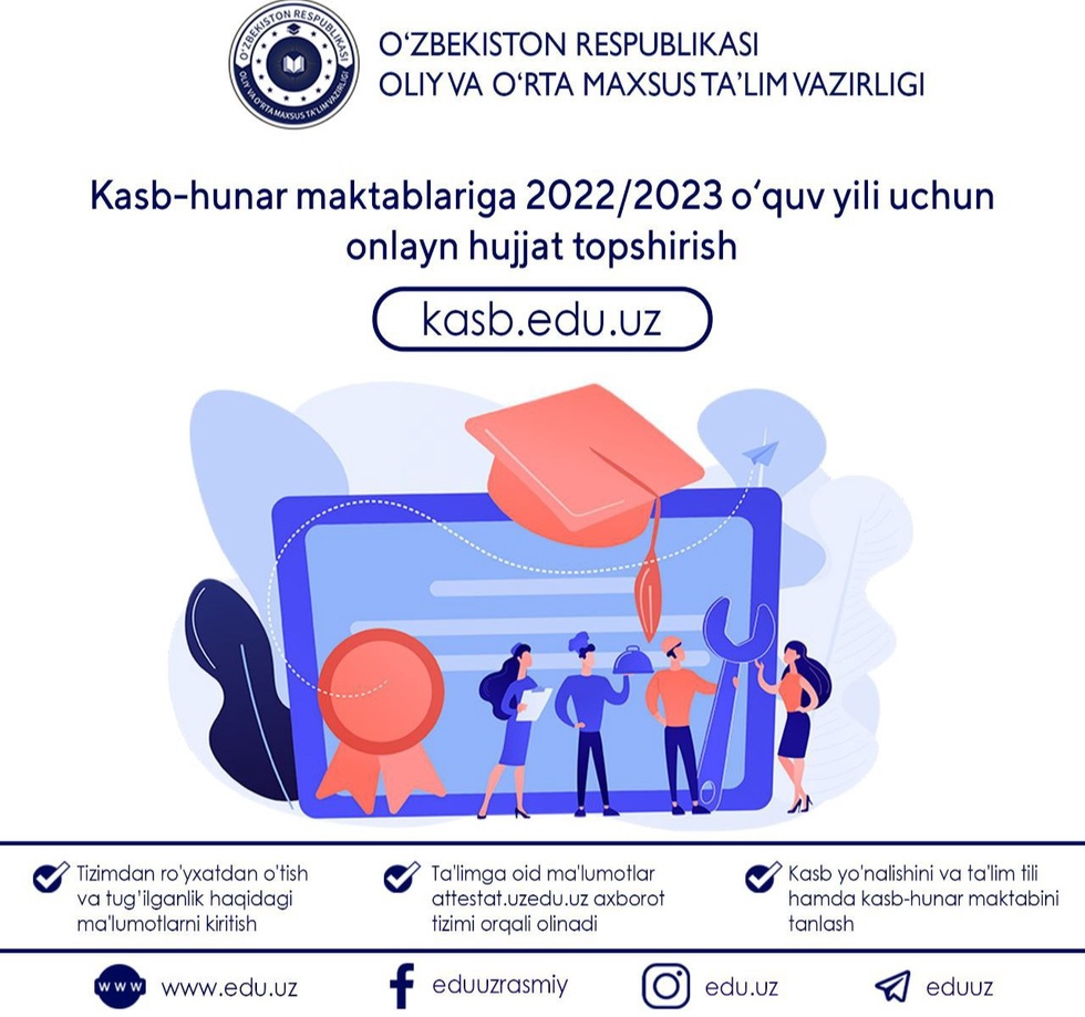 Joriy yil  9-sinf bitiruvchilarining hujjatlari kasb.edu.uz elektron platformasi orqali 1iyul kunidan 20 iyul (shu kuni ham) kuniga qadar onlayn qabul qilinadi.