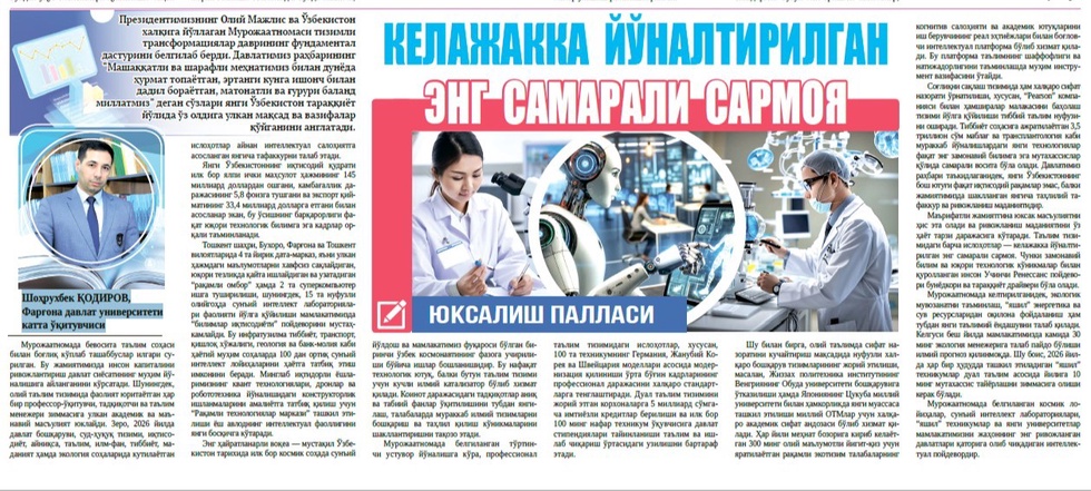 Murojaatnomada belgilangan kosmik loyihalar, sunʼiy intellekt laboratoriyalari, “yashil” texnikumlar va yangi universitetlar mamlakatimizni jahonning eng rivojlangan davlatlari qatoriga olib chiqadigan intellektual poydevordir.