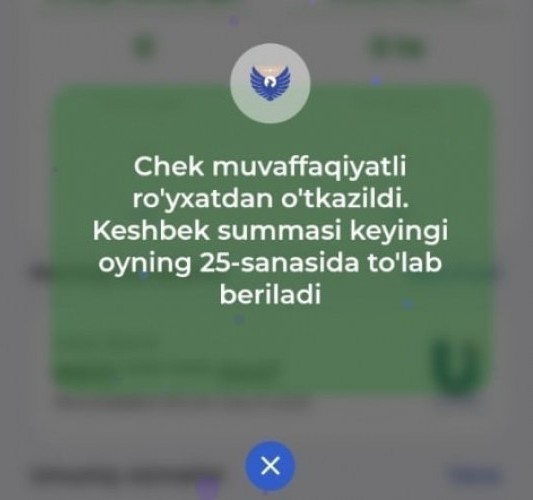 Fiskal belgili xarid cheki Soliq mobil ilovasi orqali skaner qilinganda "Chek muvaffaqiyatli ro'yxatdan o'tkazildi. Keshbek summasi keyingi oyning 25-sanasidan so'ng to'lab beriladi" xabar paydo bo'ladi.