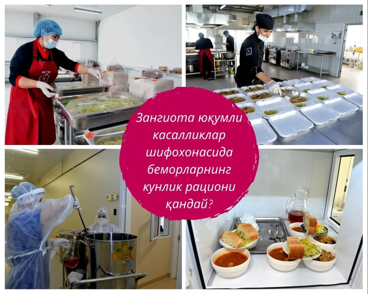 Shuni aytish lozimki, shifoxonada har bir bemorga individual yondashilgan holda 1-, 9- va 15-stolda parhez taomlari tayyorlanadi. 1-stol reanimatsiya boʻlimi, 9-stolda qandli diabet kasalligi bor bemorlar uchun taom tayyorlansa, 15-stol esa odatdagi bemorlar uchun moʻljallangan boʻladi. Barcha taomlar sanitariya qoidalariga va parhez taomlari tayyorlanish texnologiyalariga rioya qilingan holda tayyorlanadi. Koronavirusga chalingan bemorlar taomnomasi har 14 kunda yangilanadi.
