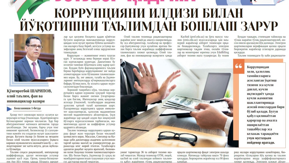 Oliy taʼlim tizimi jamiyatning tayanchi va taraqqiyotning muhim boʻgʻinidir. Ushbu tizimda adolat va shaffoflik taʼminlansa, ilm-fan va taʼlim yanada rivojlanadi, mamlakat taraqqiyotiga asos boʻladi. Korrupsiyadan xoli, halollik tamoyillariga asoslangan oʻqitish tizimi esa kuchli davlat, kuchli iqtisodiyot hamda kuchli jamiyatni shakllantirishda asosiy omillardan biri boʻlib qoladi. Bugun qabul qilinayotgan qarorlar va amalga oshirilayotgan tashabbuslar esa kelajak taraqqiyoti uchun mustahkam poydevor yaratadi.