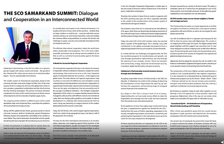Jurnalda O‘zbekiston Prezidenti Shavkat Mirziyoyevning “ShHTning Samarqand sammiti: o‘zaro bog‘liq dunyoda muloqot va hamkorlik” sarlavhali maqolasi o‘quvchilar eʼtiboriga havola etilgan.
