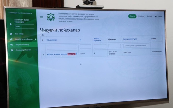 - barcha mahalliy davlat hokimiyati organlarining qarorlari va farmoyishlari “E-qaror” elektron tizimi orqali amalga oshiriladi;