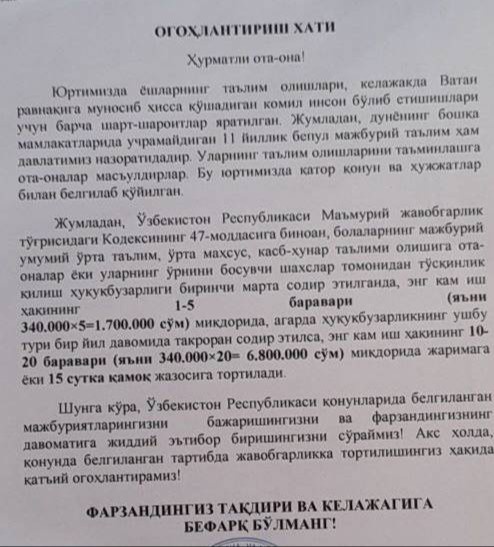 Mazkur xabarlarda endilikda dars qoldirib kelayotgan oʻquvchilarning ota-onalariga “Ogohlantirish xati” yuborilishi va bu orqali ularga turli tartibdagi maʼmuriy javobgarlik choralari qoʻllanishi aytib oʻtilgan.