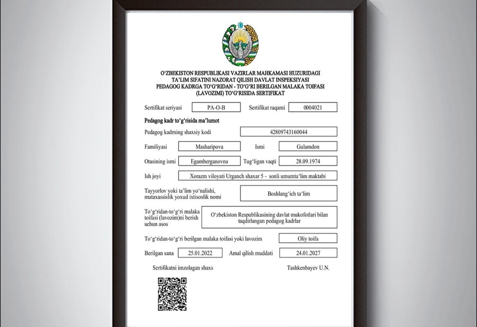 Eslatib oʻtamiz, Hukumat qarori (572-son, 17.09.2021-y.) bilan pedagog kadrlarga qogʻoz shakldagi attestatsiyadan oʻtganlik toʻgʻrisidagi sertifikat berish amaliyoti bekor qilinib, elektron raqamli imzo bilan tasdiqlangan va QR-kod qoʻyilgan elektron shakldagi sertifikat berish tartibi joriy etilgan edi.