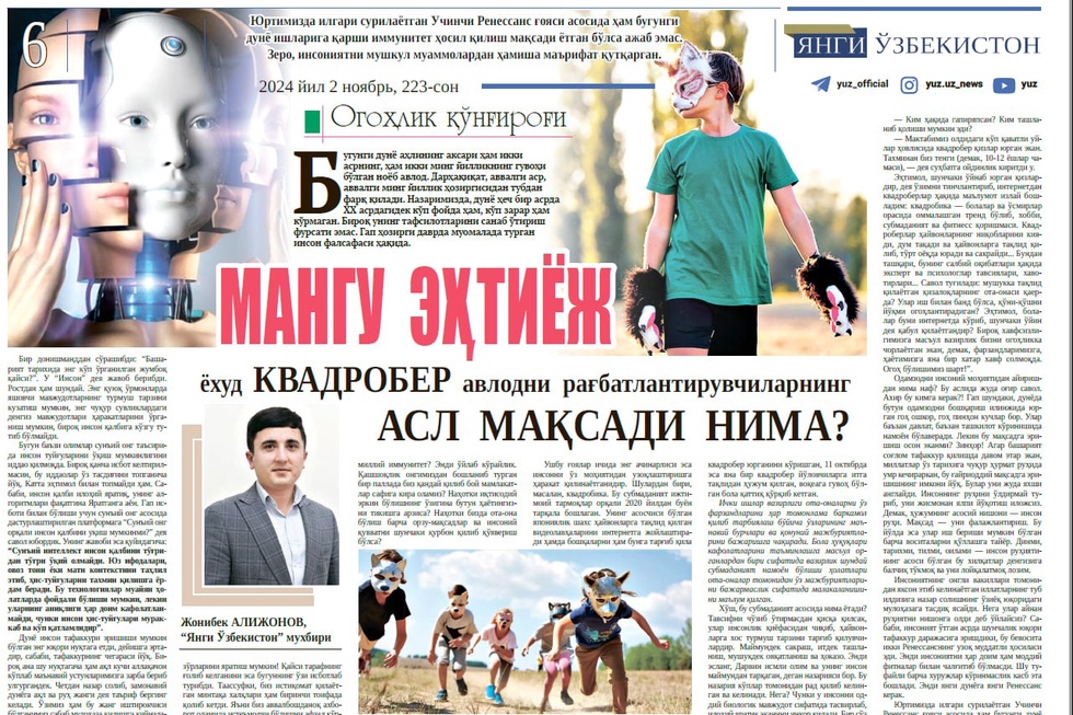 — Maktabimiz oldidagi koʻp qavatli uylar hovlisida kvadrober qizlar yurgan ekan. Taxminan biz tengi (demak, 10-12 yoshlar chamasi), — deya suhbatga oydinlik kiritdi u. Ehtimol, shunchaki oʻynab yurgan qizlardir, deya oʻzimni tinchlantirib, internetdan kvadroberlar haqida maʼlumot izlay boshladim: kvadrobika — bolalar va oʻsmirlar orasida ommalashgan trend boʻlib, xobbi, submadaniyat va fitness qorishmasi. Kvadroberlar hayvonlarning niqoblarini kiyadi, dum taqadi va hayvonlarga taqlid qilib, toʻrt oyoqda yuradi va sakraydi... Bundan tashqari, buning salbiy oqibatlari haqida ekspert va psixologlar tavsiyalari, xavotirlari... Savol tugʻiladi: mushukka taqlid qilayotgan qizaloqlarning ota-onasi qayerda? Ular ish bilan band boʻlsa, qoʻni-qoʻshni yoʻqmi ogohlantiradigan? Ehtimol, bolalar buni internetda koʻrib, shunchaki oʻyin deya qabul qilayotgandir? Biroq xavfsizligimizga masʼul vazirlik bizni ogohlikka chorlayotgan ekan, demak, farzandlarimizga, hayotimizga yana bir xatar xavf solmoqda.