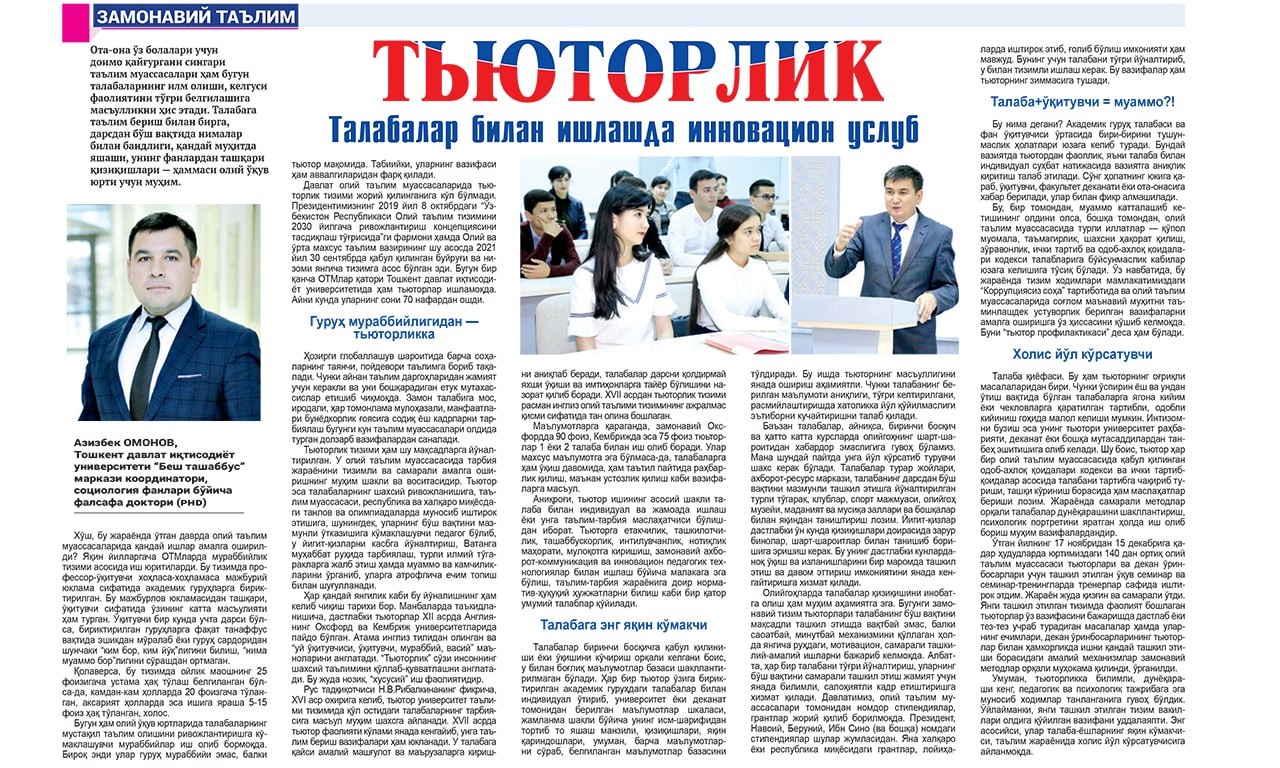 Toshkent davlat iqtisodiyot universiteti Besh tashabbus markazi koordinatori, sotsiologiya fanlari bo'yicha falsafa doktori (PhD) Azizbek Amonovning “Yangi O'zbekiston” gazetasining 2022-yil 26-mart 61 (583)-sonidagi maqolasi o'zining innovatsion ruhi bilan odamni o'ziga tortadi. Unda oliy ta'lim tizimidagi tarbiyaviy ishlarni modernizatsiya qilishda t`yutorlar mehnati, mahoratining roli ochib berilibdi.