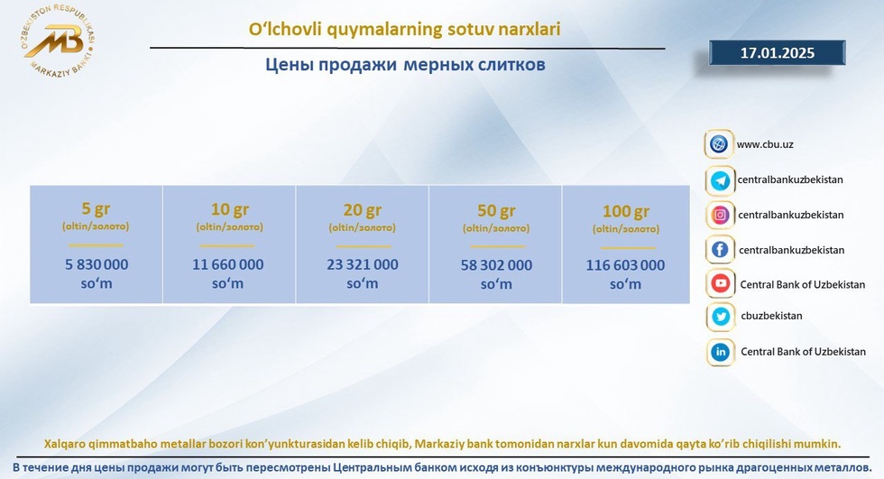 Eslatib oʻtamiz, oltin quymalarining sotish narxlari har kuni Markaziy bank tomonidan milliy valyutada eʼlon qilib boriladi.