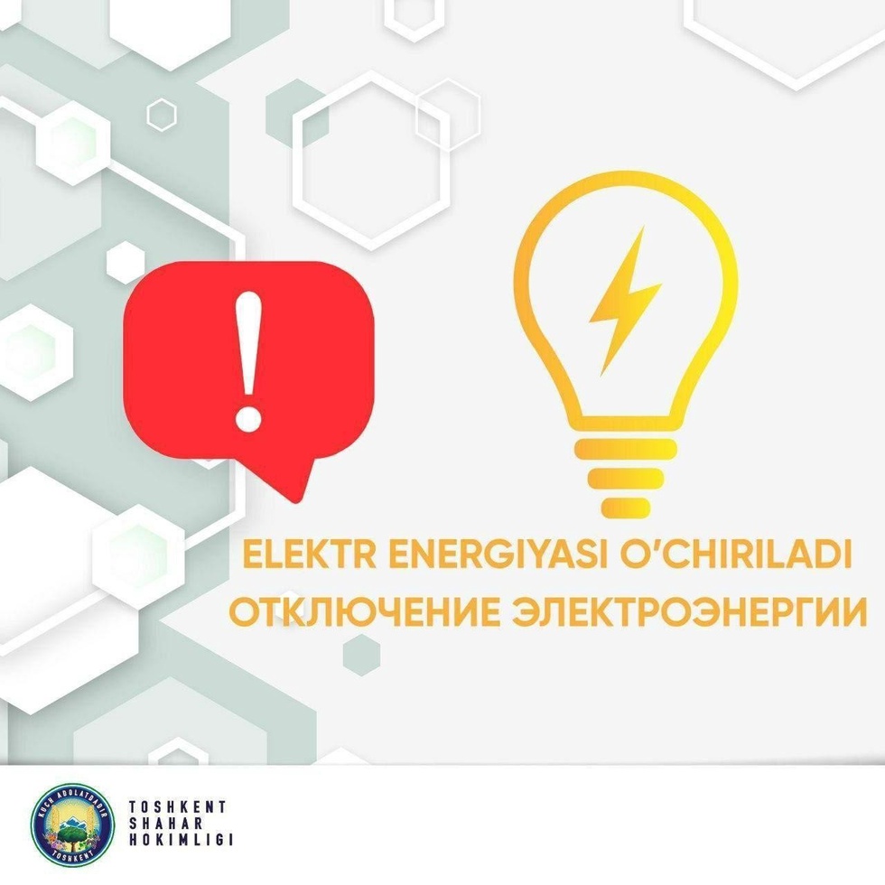 Yakkasaroy tumanining: Zarbog', Voxidova, Rakatboshi, Yusuf Hos Hojib, G.Karimova, Akilova, Mirakilova, Bog'idil, Mirakilova, Mirakilova 1-tor, Shmita, M.Yoqubova, Mirobod, Mirobod 1- va 2-tor hamda Usmon Nosir ko'chalari hududidagi aholi yashash xonadonlarida elektr energiyasi vaqtinchalik o'chiriladi.