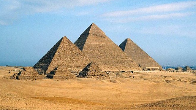 Xeops piramidasi nomi bilan mashhur bo'lgan ehrom miloddan avvalgi XXVI asrda qurilgan bo'lib, balandligi taxminan 230 metr bo'lgan. U umumiy massasi 5,75 million tonna bo'lgan 2,3 million tosh blokidan iborat.