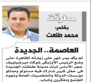 Maqolada O‘zbekiston Prezidenti Shavkat Mirziyoyevning Qohira shahriga rasmiy tashrifidan bir oy o‘tib davlat muassasalari xodimlari, jamoat arboblari, mashhur kishilar, ziyolilar va yoshlar ishtirokida o‘tkazilgan tantanali marosimda Yangi Toshkent shahrining kurilishiga tamal toshini qo‘ygani va davlatimiz rahbari poytaxtning istiqbolini belgilashda uzoqni o‘ylash, uni barqaror rivojlantirish, yaqin 15-20 yilga mo‘ljallangan rejalarni belgilash zarurligini taʼkidlagani misrlik o‘quvchilarning eʼtiboriga havola qilingan.