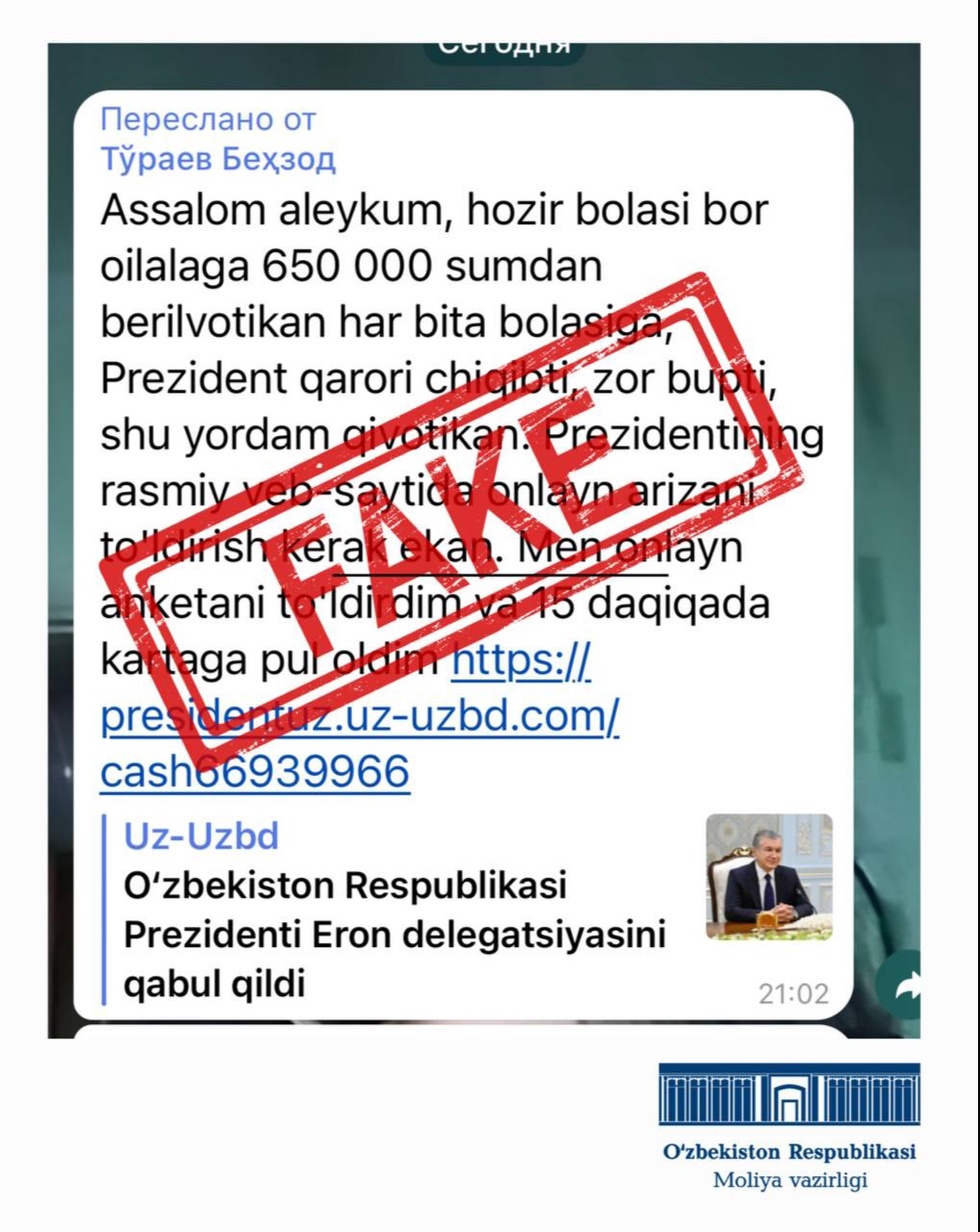 Moliya vazirligi fuqarolarni bunday maʼlumotlarga ishonmaslikka chaqirdi: