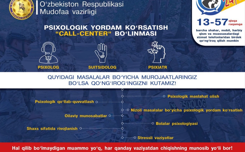 13 57 qisqa raqamlari orqali harbiy xizmatchilar, Qurolli Kuchlar xizmatchilari va ularning oila a'zolari, shuningdek, fuqarolar ham mutaxassislardan psixologik maslahatlar olishi mumkin.