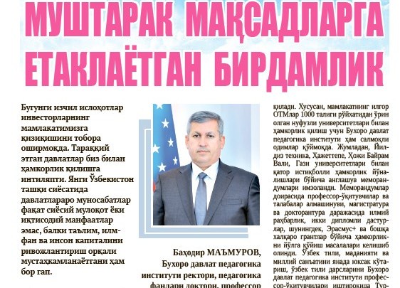 Yurtimizda taʼlim sohasiga qara­tilayotgan yuksak eʼtibor oliy taʼlim muassasalari oldiga yangi vazifa­larni qoʻymoqda. Xalqaro tashriflar natijasida berilayotgan imkoniyatlar oʻqitish sifatini oshirish, xalqaro tajribani atroflicha oʻrganish va uni milliy taʼlim tizimiga moslashti­rishni talab etadi. Turkiya univer­sitetlari bilan hamkorlik yoshlari­mizning dunyoqarashini kengaytirish, ilmiy salohiyatini oshirish va global raqobatga tayyor mutaxassislar etib tayyorlashda muhim omil boʻlib xizmat qiladi. Xususan, mamlakatning ilgʻor OTMlar 1000 taligi roʻyxatidan oʻrin olgan nufuzli universitetlari bilan hamkorlik qilish uchun Buxoro davlat pedagogika instituti ham salmoqli odimlar qoʻymoqda. Jumladan, Yil­diz texnika, Hajettepe, Hoji Bayram Vali, Gazi universitetlari bilan qator istiqbolli hamkorlik yoʻna­lishlari boʻyicha anglashuv memoran­dumlari imzolandi. Memorandumlar doirasida professor-oʻqituvchilar va talabalar almashinuvi, magistratura va doktorantura darajasida ilmiy rahbarlik, ikki diplomli dastur­lar, shuningdek, Erasmus+ va boshqa xalqaro grantlar boʻyicha hamkorlik­ni yoʻlga qoʻyish masalalari kelishib olindi. Oʻzbek tili, madaniyati va milliy sanʼatini yanada yuksak koʻta­rish, oʻzbek tili darslarini Buxoro davlat pedagogika instituti profes­sor-oʻqituvchilari ishtirokida Tur­kiya universitetlarida onlayn oʻtish, miniatyura sanʼatini rivojlanti­rish maqsadida oliygohlar oʻrtasida talabalar almashinuvini yoʻlga qoʻ­yish boʻyicha aniq mexanizmlar ishlab chiqildi.