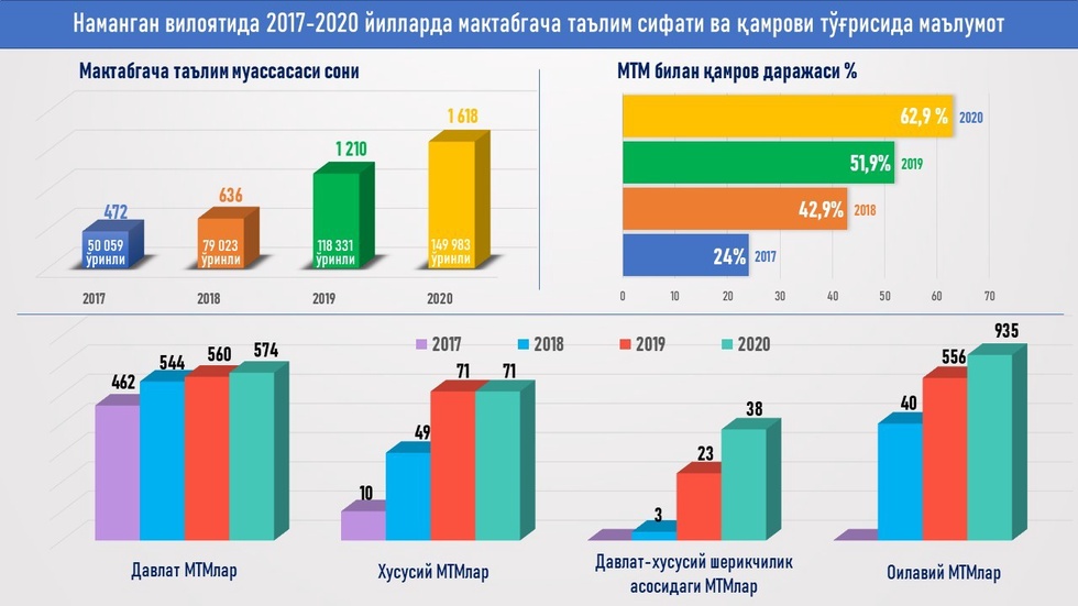 Shuningdek, bo'sh turgan binolar va faoliyat ko'rsatmayotgan maktabgacha ta'lim muassasalari qaytadan moslashtirilib, 112 ta davlat maktabgacha ta'lim muassasalari, 71 ta nodavlat maktabgacha ta'lim muassasalari, 38 ta davlat xususiy sherikchilik asosida, 935 ta oilaviy nodavlat maktabgacha ta'lim tashkilotlari tashkil etildi.