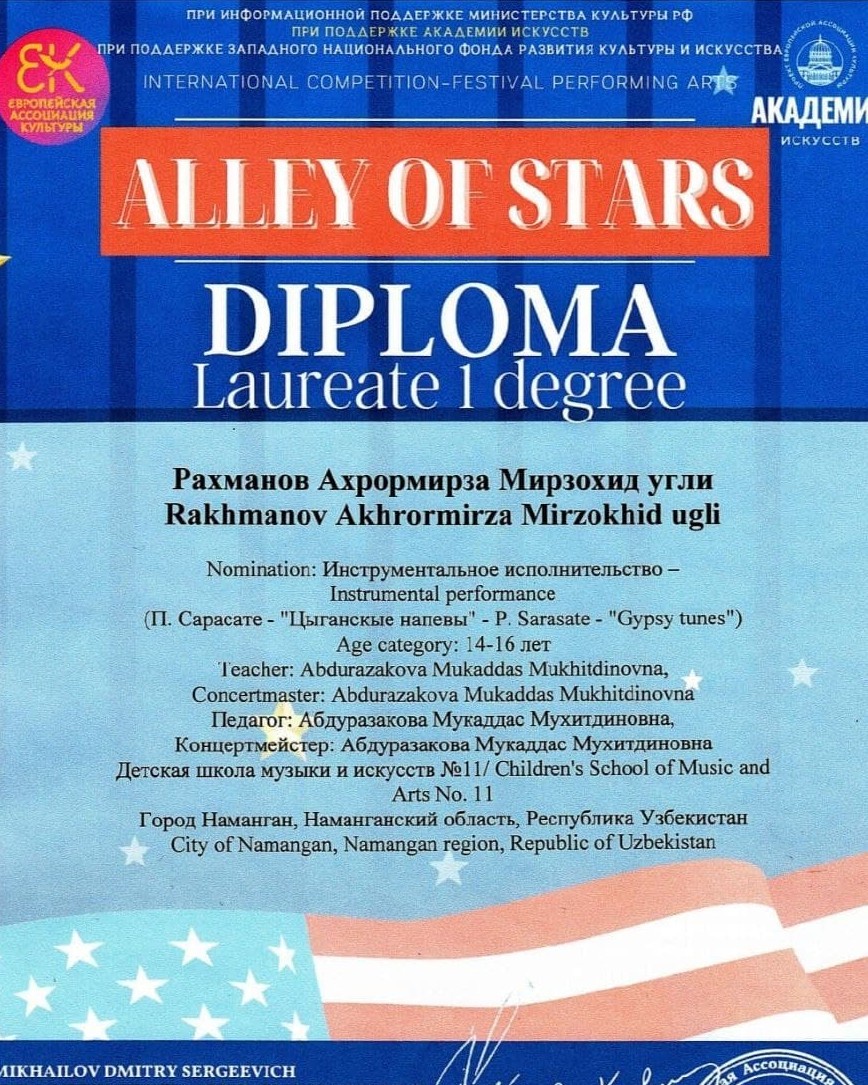 Namangan shahridagi 1-IDUMning 9-sinf oʻquvchisi Ahrormirzo Rahmonov bir necha yildirki, musiqa sanʼati bilan shugʻullanib keladi. Ana shunday imkoniyatlardan oqilona foydalangan holda hozirga qadar koʻplab xalqaro tanlovlar, musiqa va sanʼat festivallari hamda bellashuvlarda muvaffaqiyat qozonayotgan yosh isteʼdod sohibi yaqinda Los-Anjelesda oʻtkazilgan onlayn tanlovda gʻoliblikni qoʻlga kiritdi.