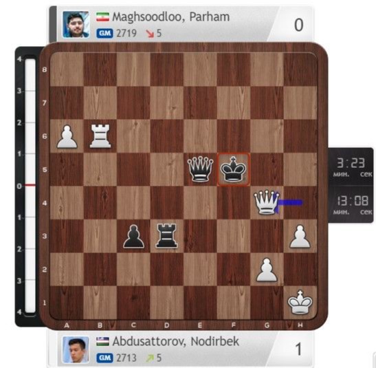 “Masters” guruhida Nodirbek Abdusattorov eronlik Parham Magsudluga qarshi dona surdi va deyarli 6 soatlik oʻyindan soʻng raqibini mot qilishga erishdi. Hamyurtimizdan ajoyib gʻalaba! Shaxmat qiroli sifatida eʼtirof etiladigan norvegiyalik Magnus Karlsen esa niderlandiyalik Anish Giriga imkoniyatni boy berib qoʻydi.