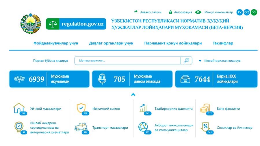 Hozirda portal test rejimida ishlamoqda. Adliya vazirligi vakillari ushbu portalni foydalanuvchilar uchun iloji boricha qulaylashtirish niyatida. Shu munosabat bilan, qonun hujjatlari loyihalarini ishlab chiquvchilar va foydalanuvchilar portalni modernizatsiya qilish jarayonida shaxsan ishtirok etish imkoniyatiga ega. Buning uchun takliflar va tavsiyalarni muhokama@adliya.uz elektron pochta manziliga yuborishingiz kerak.