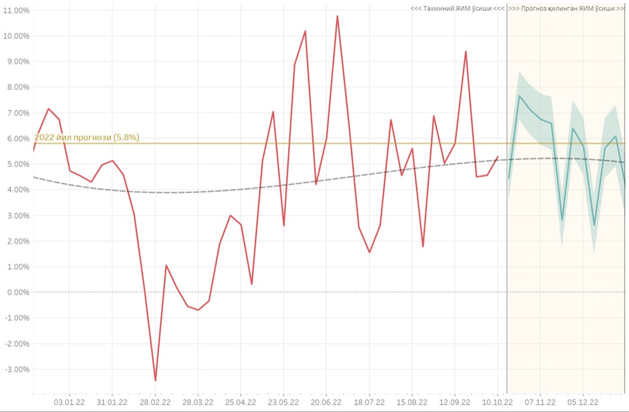 2022-yil 3-choragida haftalik YIM dinamikasi o'sish tendentsiyasi davom etib kelmoqda. Bunday holat joriy yilning 2-choragida ham kuzatilgan edi. 2022-yil 3- va 4-choraklarida o'sish tendentsiyasi ortib borishi birinchi yarim yillik ko'rsatkichlariga nisbatan yillik hisobda YAIMning kamida 0,75 foizga oshishiga olib kelishi kutilmoqda.
