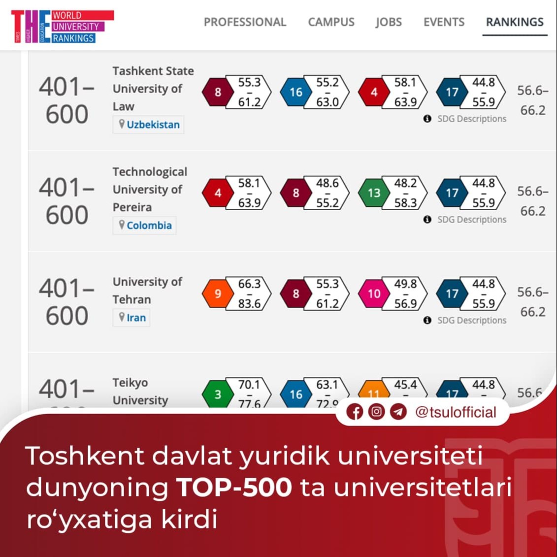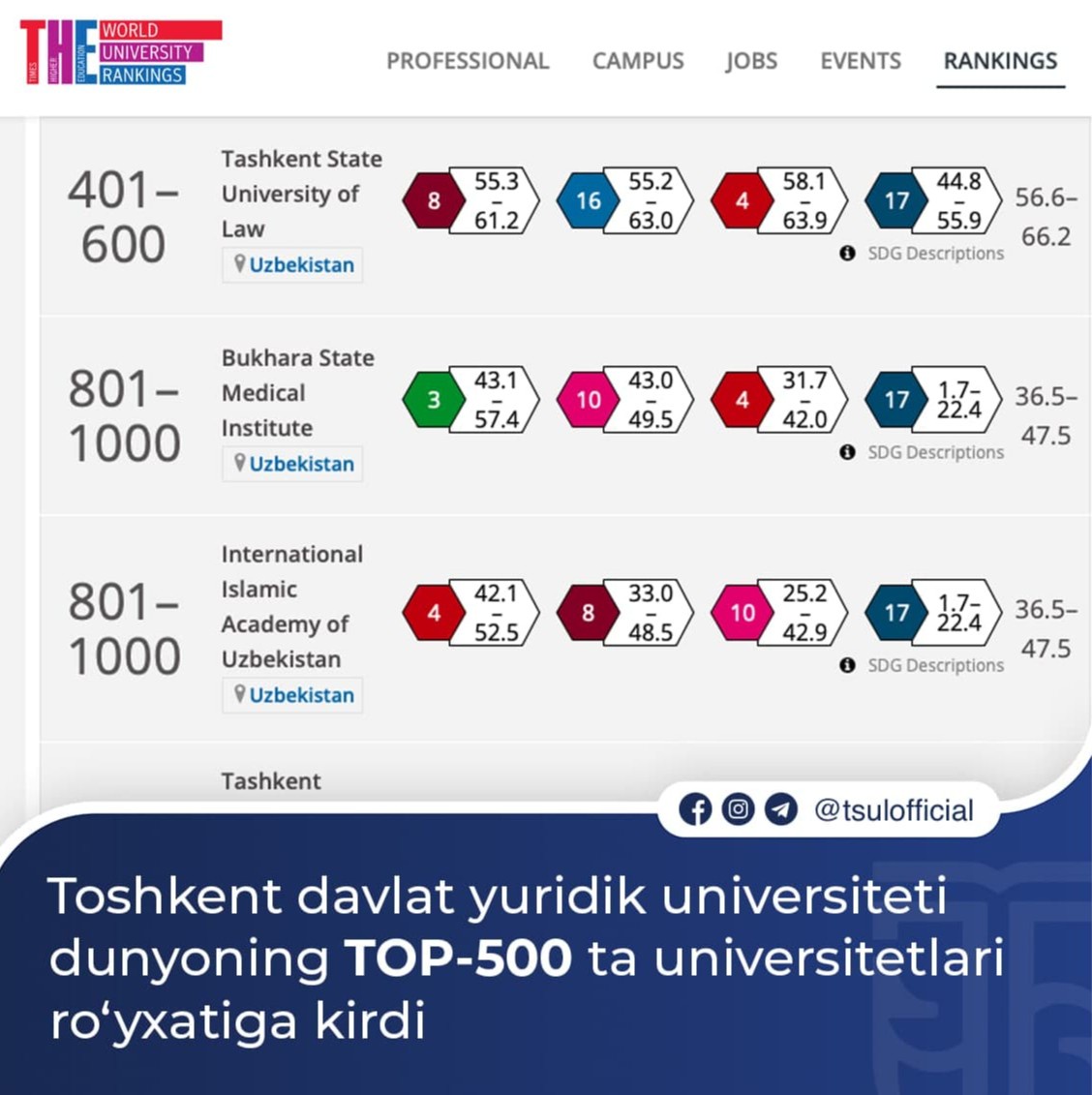 Taʼkidlash kerak, Times Higher Education tashkilotining “THE Impact Rankings” reytingi dunyo mamlakatlari universitetlari tomonidan BMTning Barqaror rivojlanish maqsadlarini hayotga tatbiq etish yoʼlidagi muvaffaqiyatlarini baholaydi. Ushbu reytingda Toshkent davlat yuridik universiteti dunyoning 94 ta mintaqa va davlatlaridan qatnashgan mingdan ortiq universitetlar orasida 401-oʼrinni egalladi. TDYuU mazkur reytingda ishtirok etgan mamlakatimiz oliy taʼlim muassasalari orasida eng yuqori natijani qayd etdi.