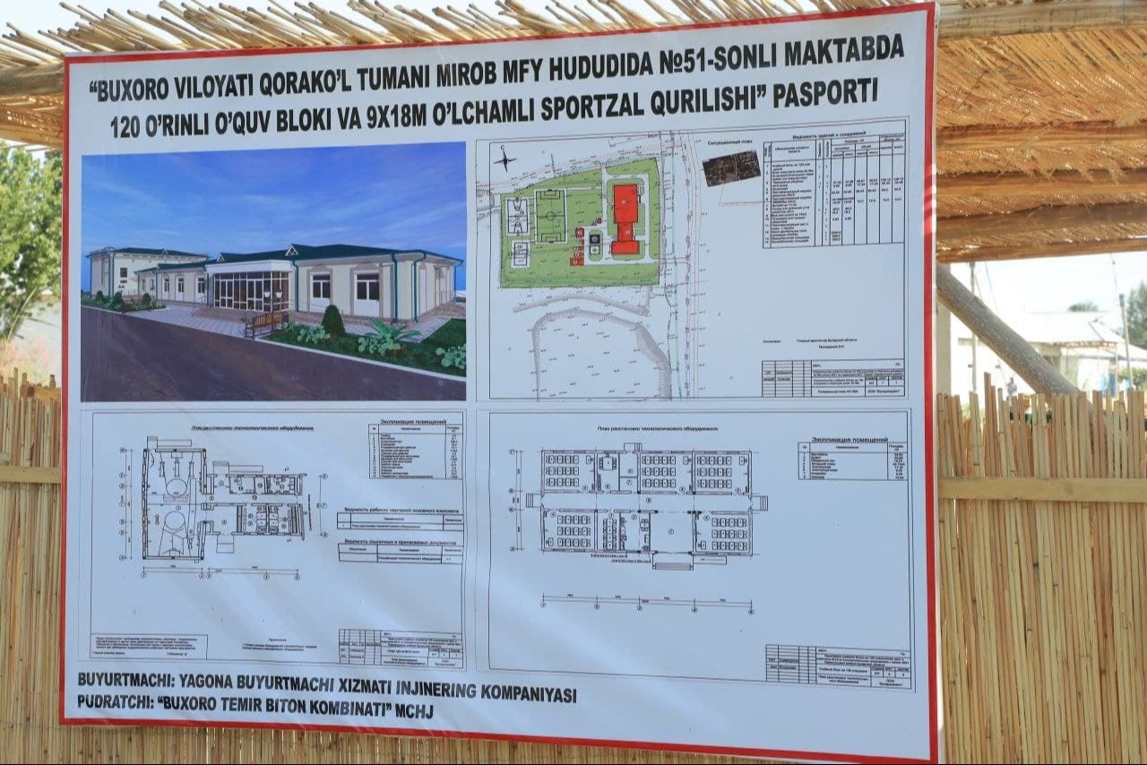 Jumladan, “Mirob” mahallasidagi 51-sonli umumtaʼlim maktabida talab darajasidagi 120 oʻrinli oʻquv korpusini va 9x18 metr hajmdagi sport zalini barpo etish uchun 2 milliard 700 million soʻm mablagʻ ajratilgan. Qurilish-bunyodkorlik ishlari “Buxoro temir–beton kombinati” MCHJ pudrat tashkiloti tomonidan bajarilmoqda, hozirda obyektda poydevor tiklash ishlari yakunlanmoqda.