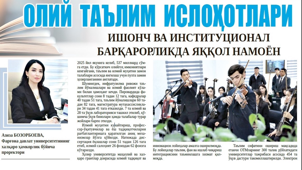 Bunga Fargʻona davlat universitetidagi faoliyatim mobaynida oʻzim guvoh boʻlyapman. Jumladan, 2021-yildan buyon universitetimizda moliyaviy barqarorlikni mustahkamlash, infratuzilmani bosqichma-bosqich rivojlantirishga qaratilgan tizimli choralar koʻrilishi natijasida oʻsha yili 241 milliard soʻm boʻlgan universitet byudjeti 2025-yil yakuniga kelib, 537 milliard soʻmga yetdi. Bu koʻrsatkich oliygoh imkoniyatlari kengaygani, taʼlim va ilmiy muhitni zamon talablari asosida yangilash uchun puxta zamin hozirlanganini anglatadi.
