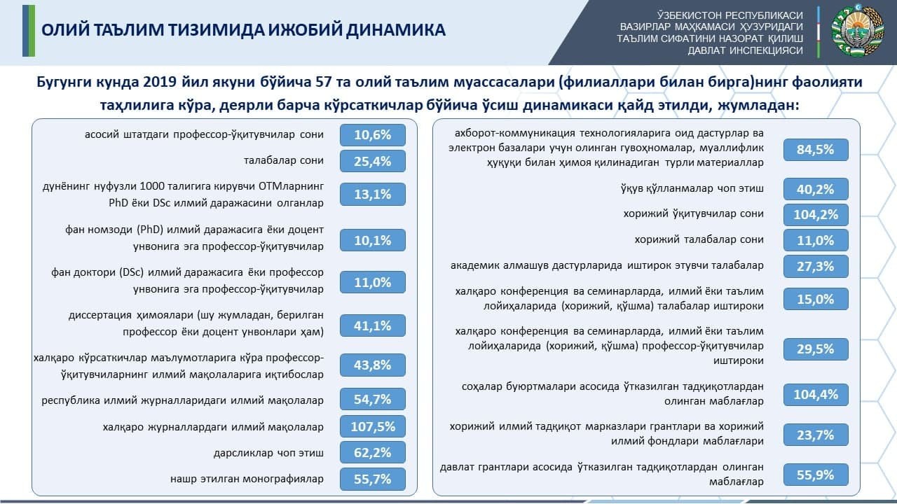 Oliy ta'lim muassasalarining ilmiy salohiyati 2017 yilda 30,6 foiz, 2018 yilda 34,1 foiz va 2019 yilda 35,5 foiz natija qayd etib, so'nggi 3 yilda o'rtacha 5 foiz oshgan.