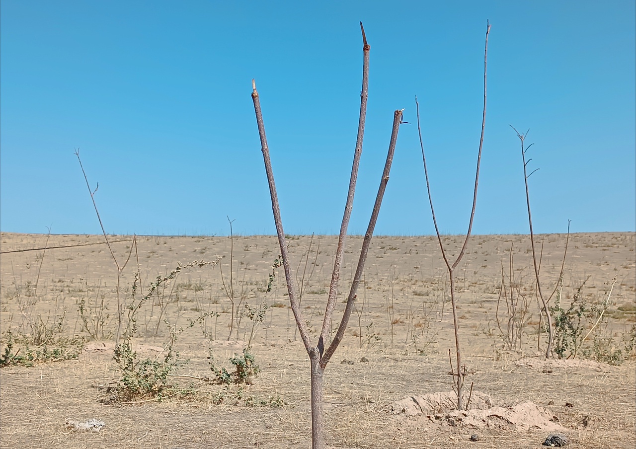 Biroq shuncha mehnat, sarflangan mablag' bugun havoga uchdi. Siz suratlarda ko'rib turgan ko'chatlar bugun qurib, bog' yana yaydoq sahroga aylangan. Qurigan ko'chatlarni ko'rib, hafsalangiz pir bo'ladi.