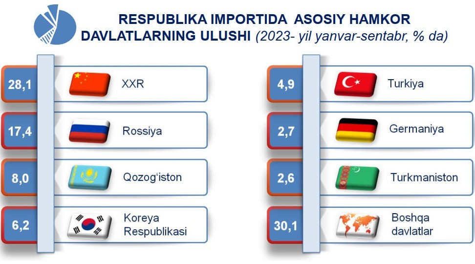 9 oyda yetti yirik hamkor davlatlar (XXR, Rossiya, Qozog‘iston, Koreya Respublikasi, Turkiya, Germaniya va Turkmaniston) ulushi jami importning 2/3 qismini tashkil etdi.
