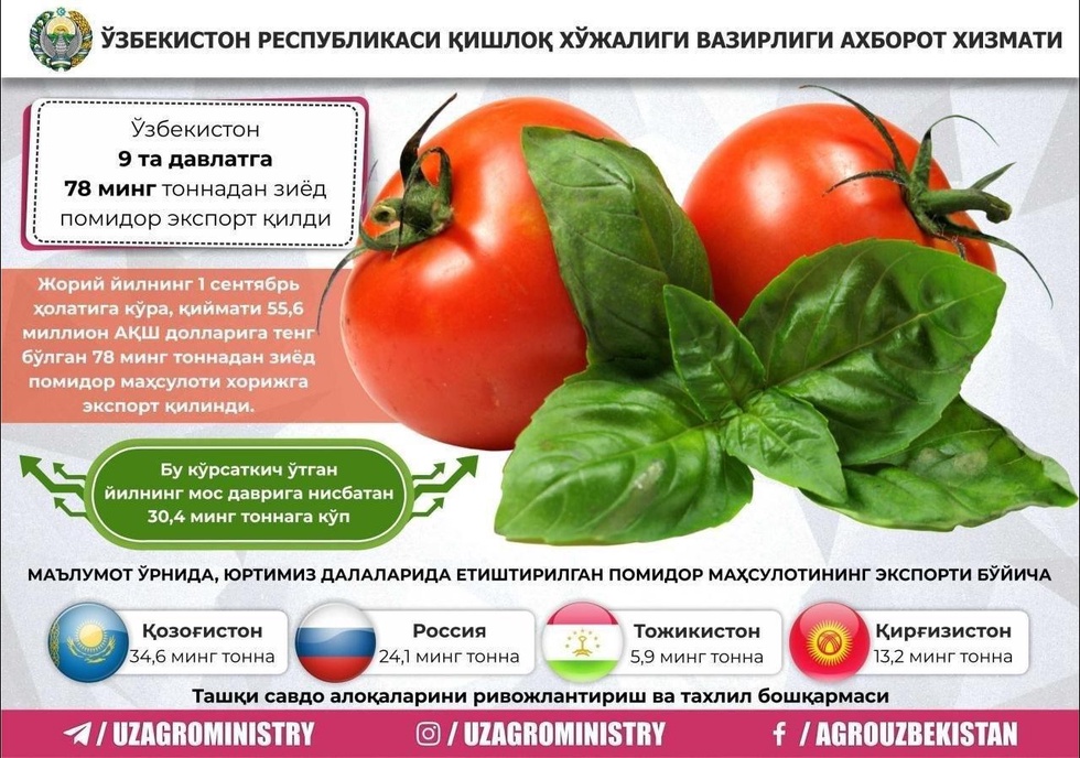 Shuningdek, Rossiya Federatsiyasiga 24,1 ming tonna, Tojikistonga 5,9 ming tonna va Qirg'izistonga 13,2 ming tonna pomidor eksport qilingan.