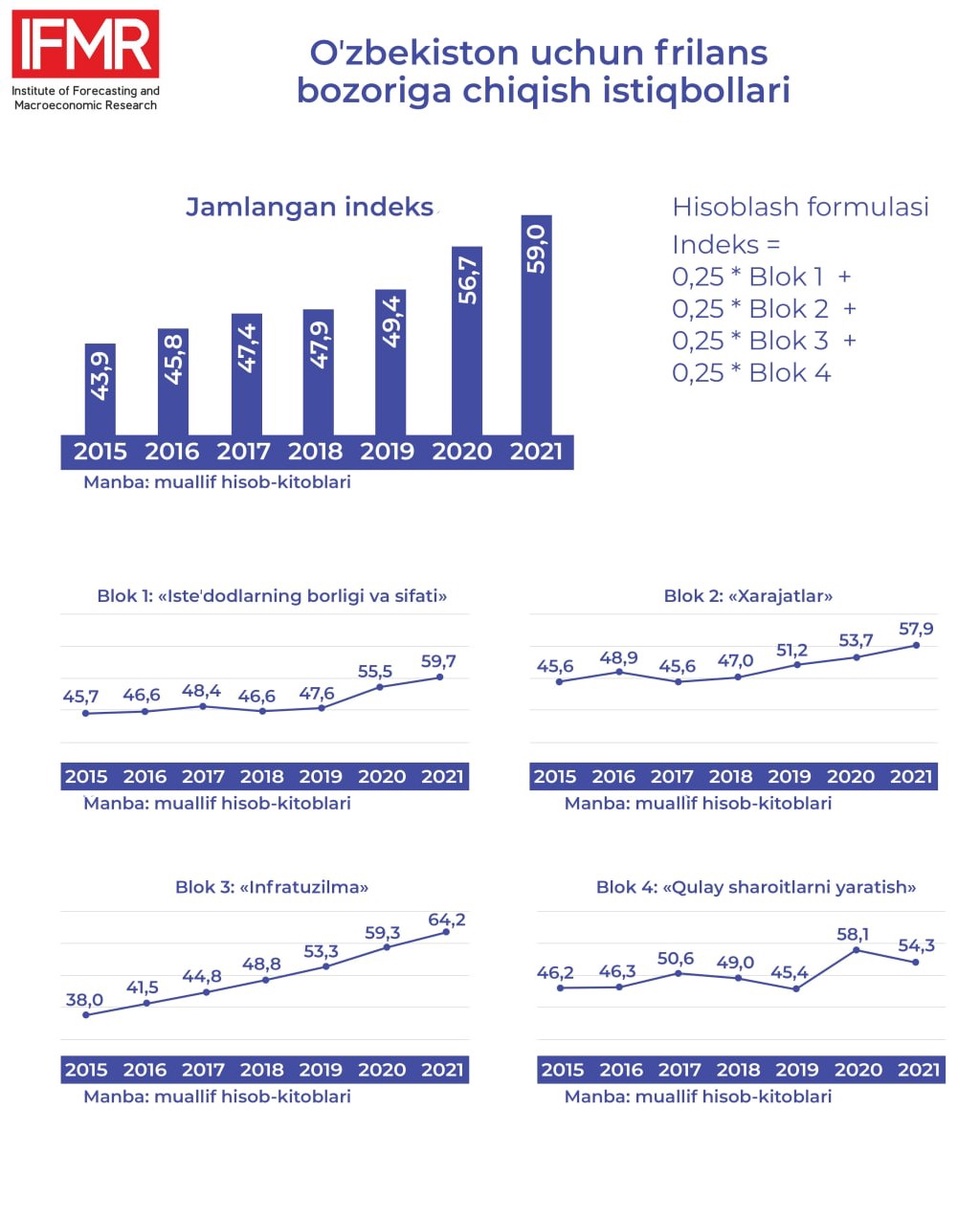 Prognozlashtirish va makroiqtisodiy tadqiqotlar instituti ekspertlari oʻtkazgan tadqiqot davomida 2015-2021-yillarda Oʻzbekistonning frilans bozoriga kirish uchun tayyorlik indeksi hisoblab chiqildi va quyidagi asosiy natijalar olindi: