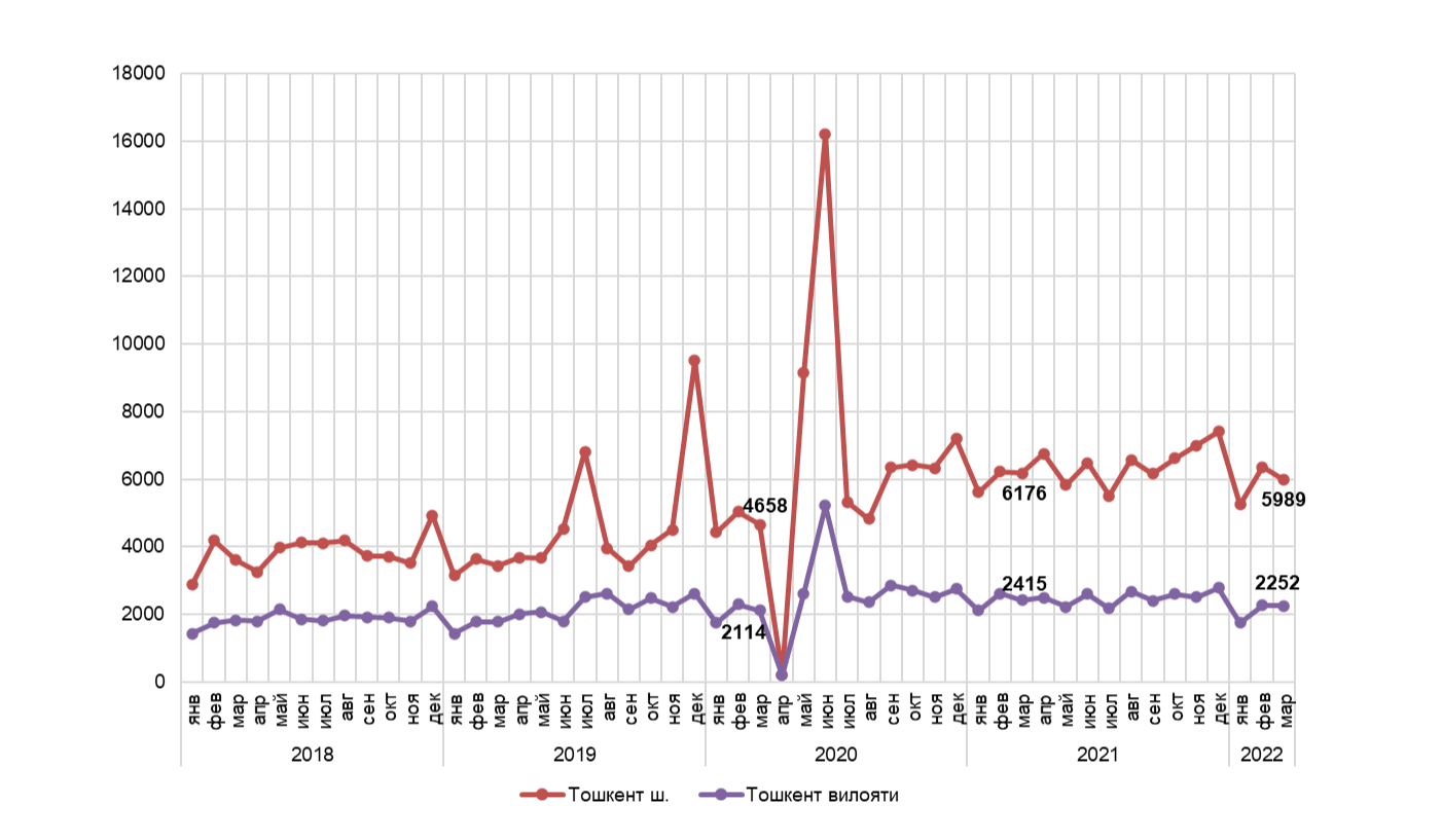 Toshkent shahri va Toshkent viloyatida koʼchmas mulk oldi-sotdisi boʼyicha tuzilgan shartnomalar soni