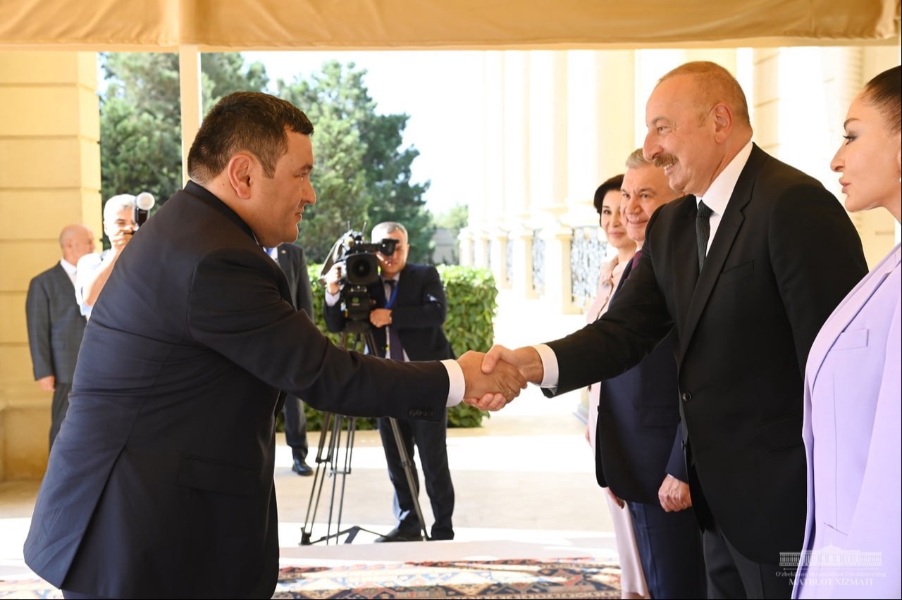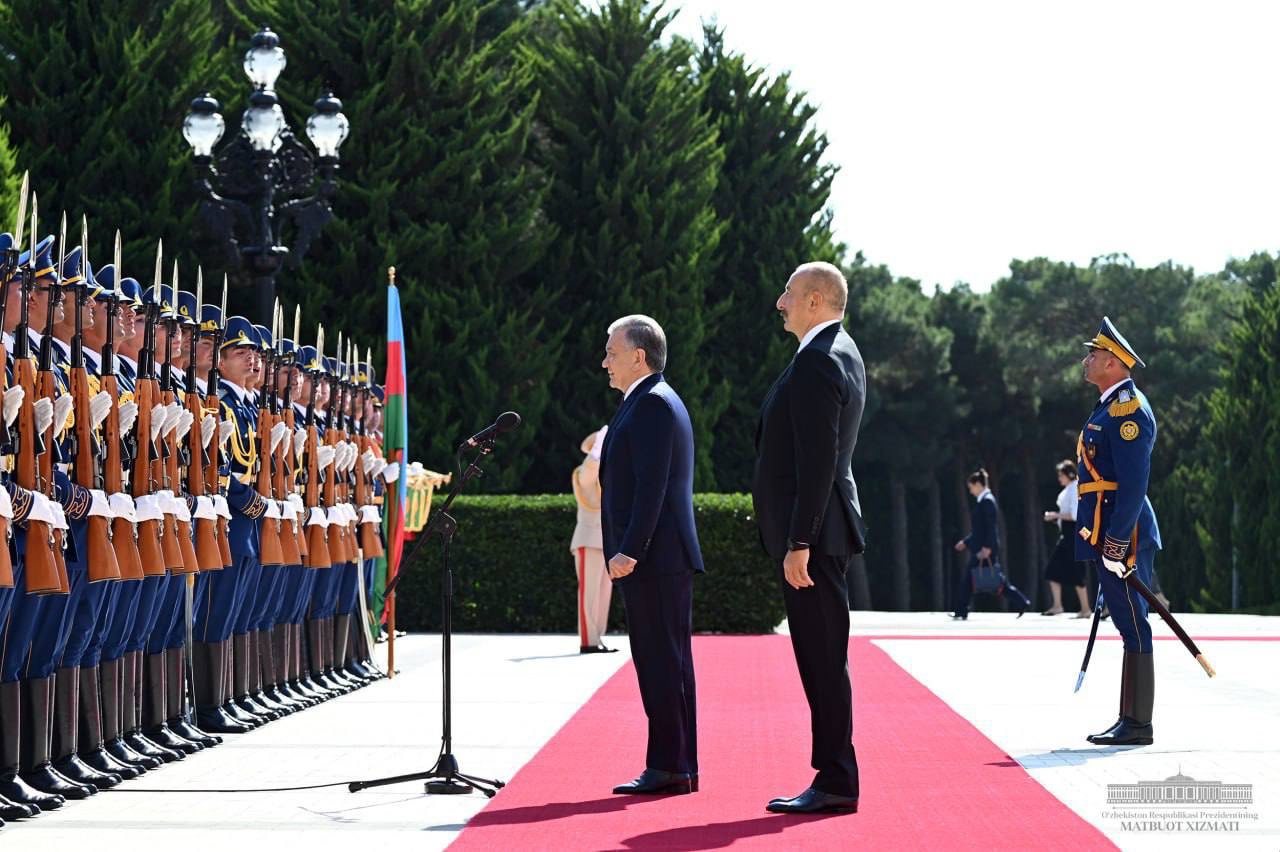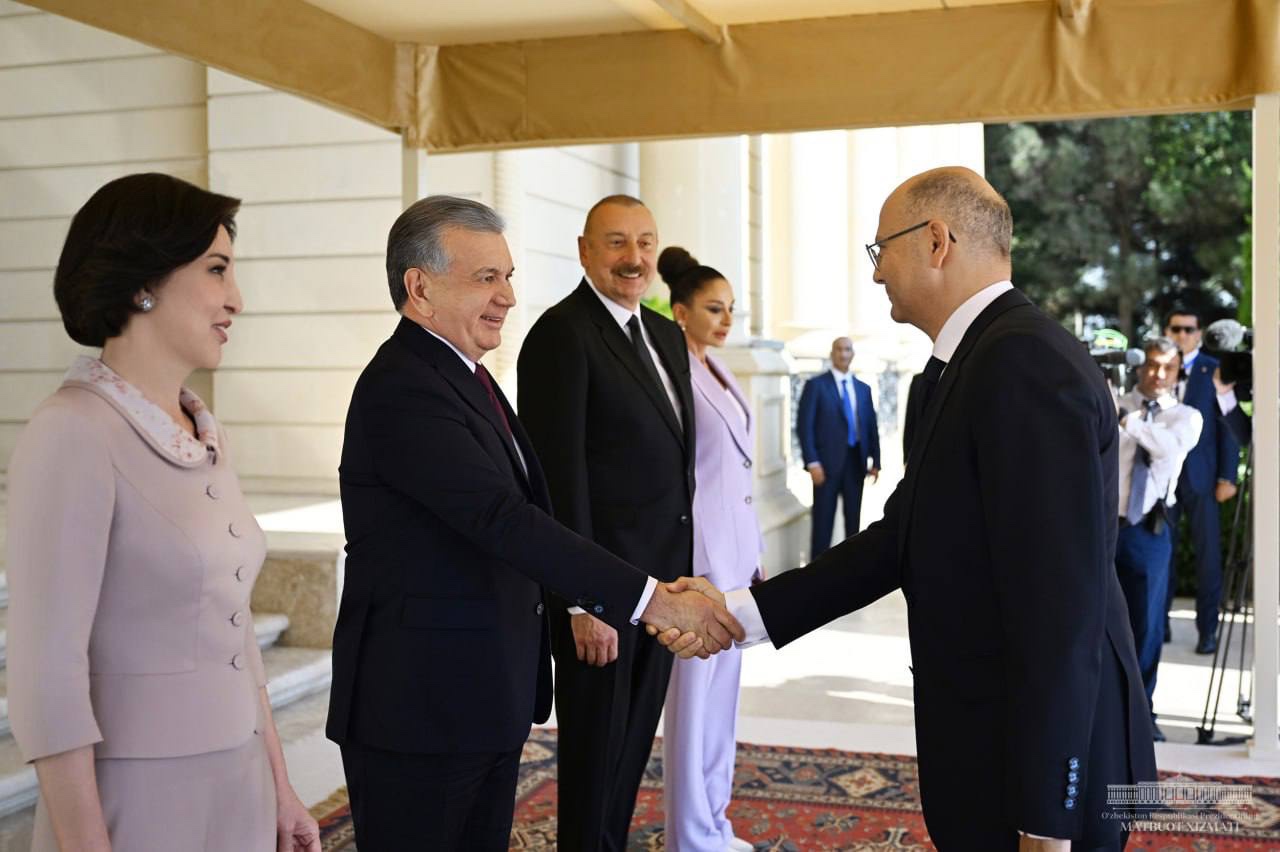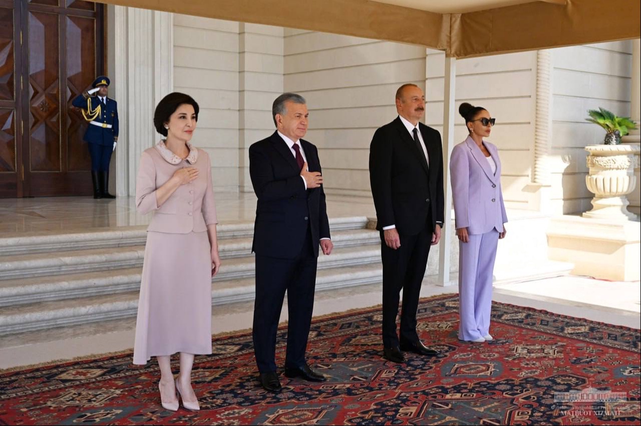 O‘zbekiston yetakchisi Shavkat Mirziyoyev va rafiqasini Ozarbayjon Prezidenti Ilhom Aliyev va rafiqasi samimiy qarshi oldi.