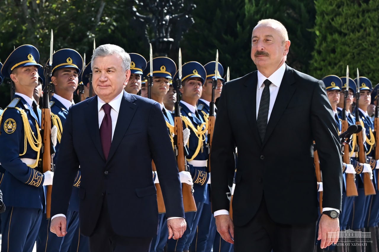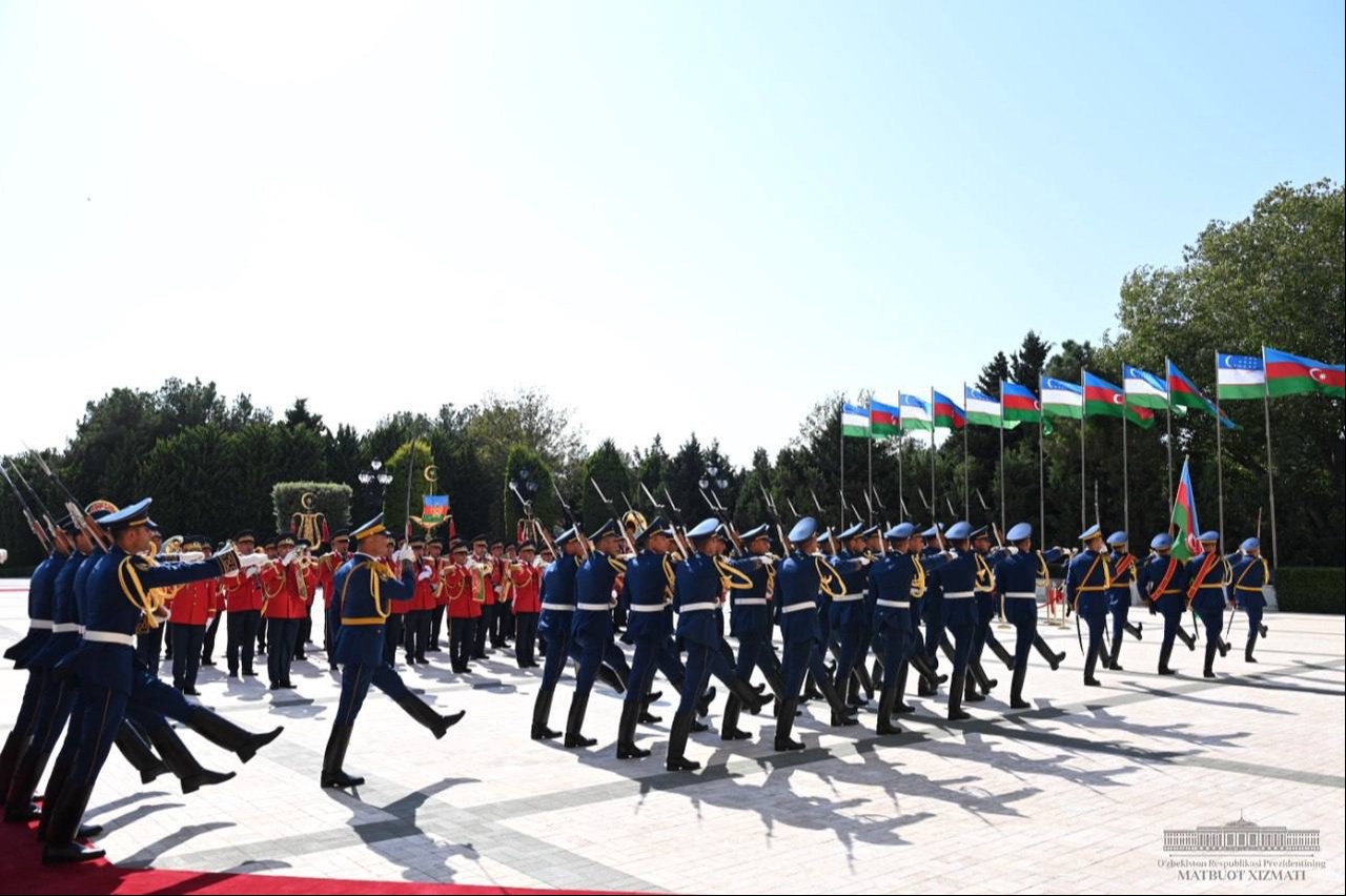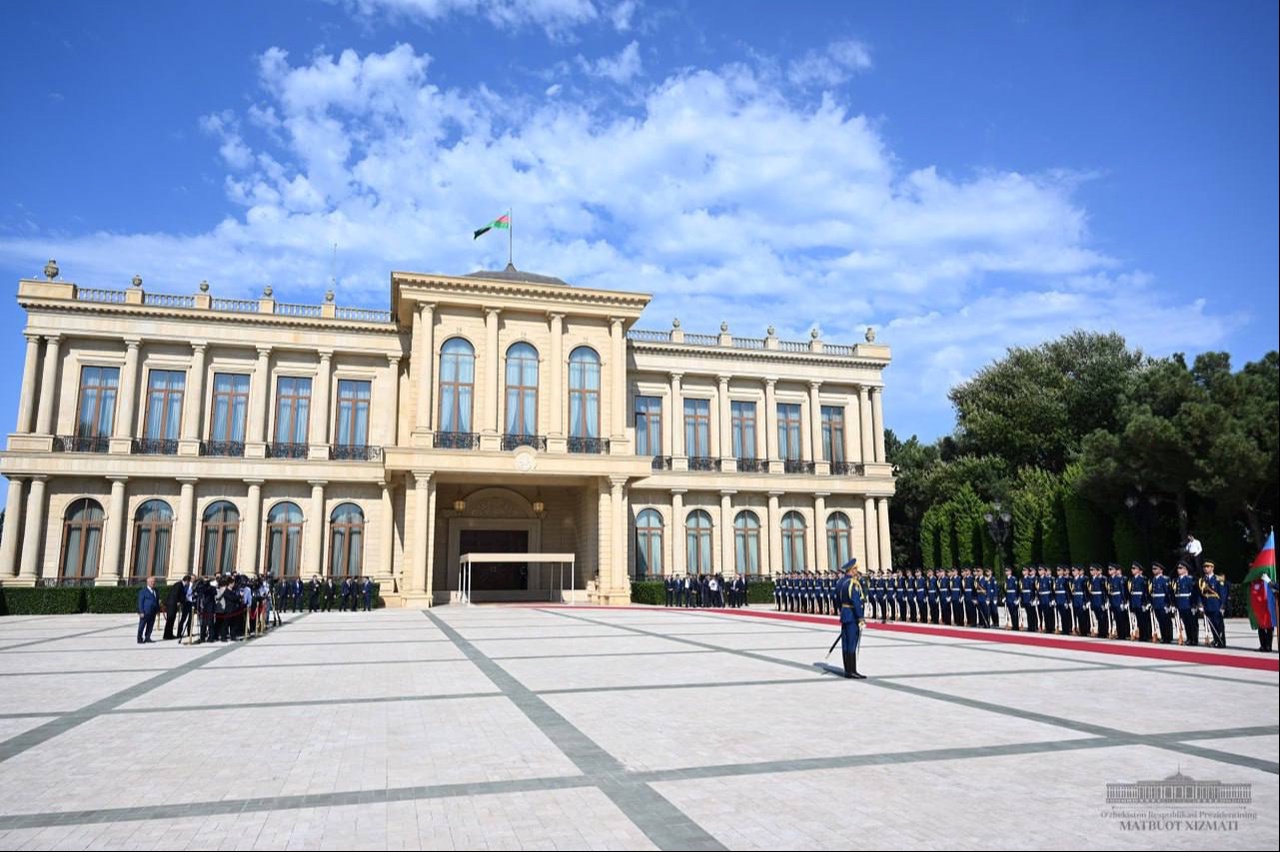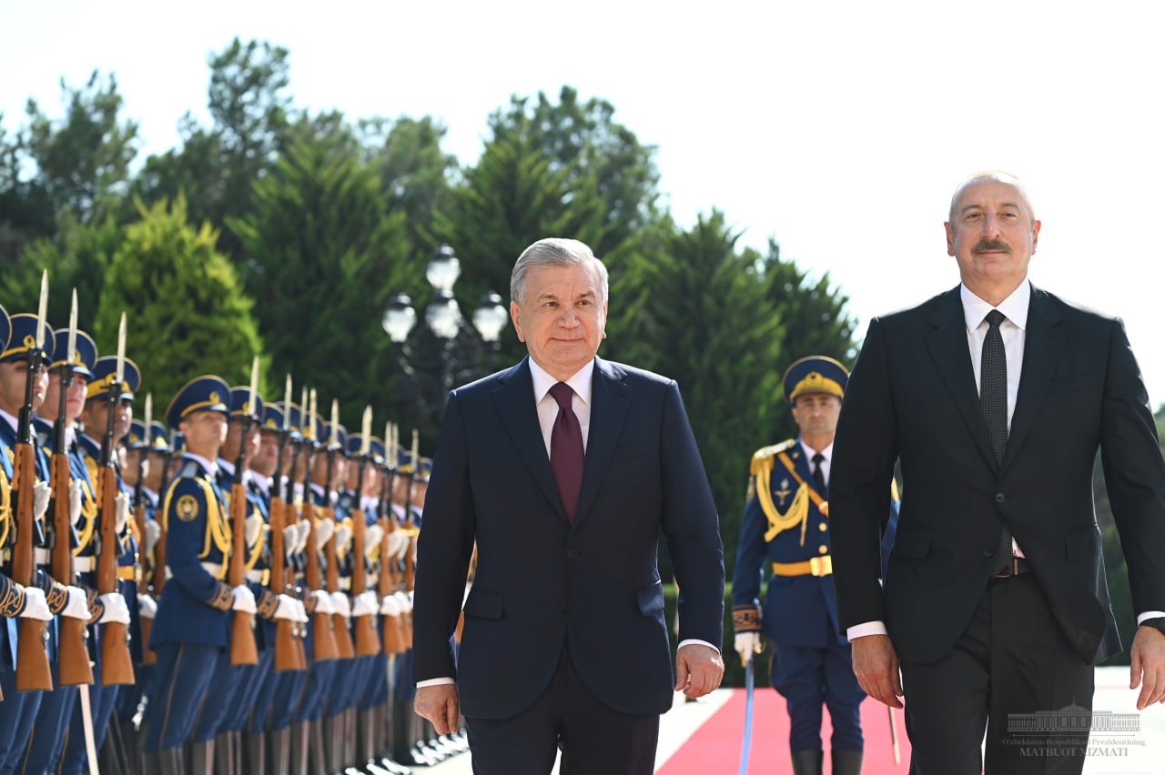 O‘zbekiston yetakchisi Shavkat Mirziyoyev va rafiqasini Ozarbayjon Prezidenti Ilhom Aliyev va rafiqasi samimiy qarshi oldi.