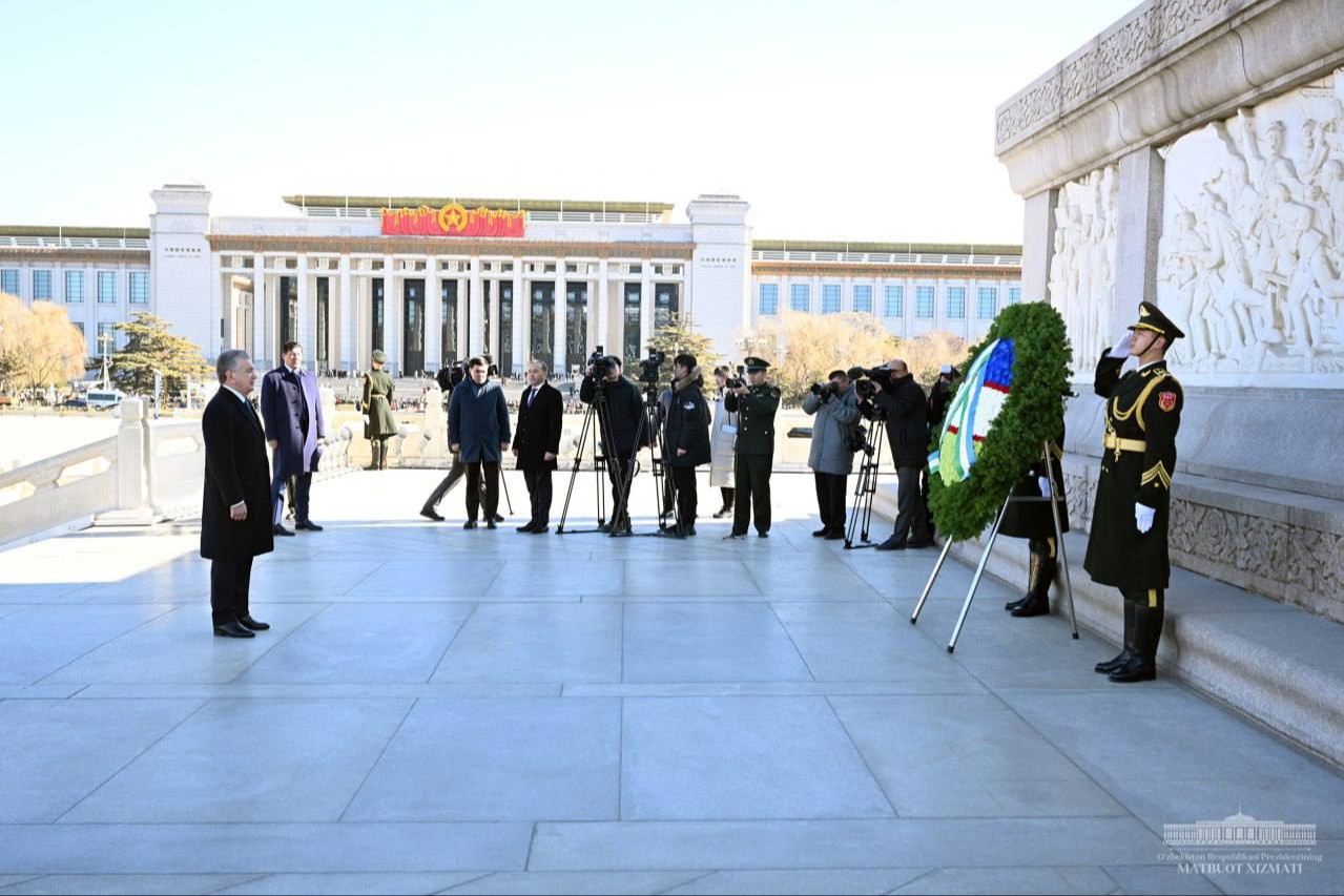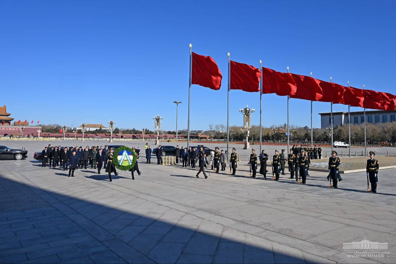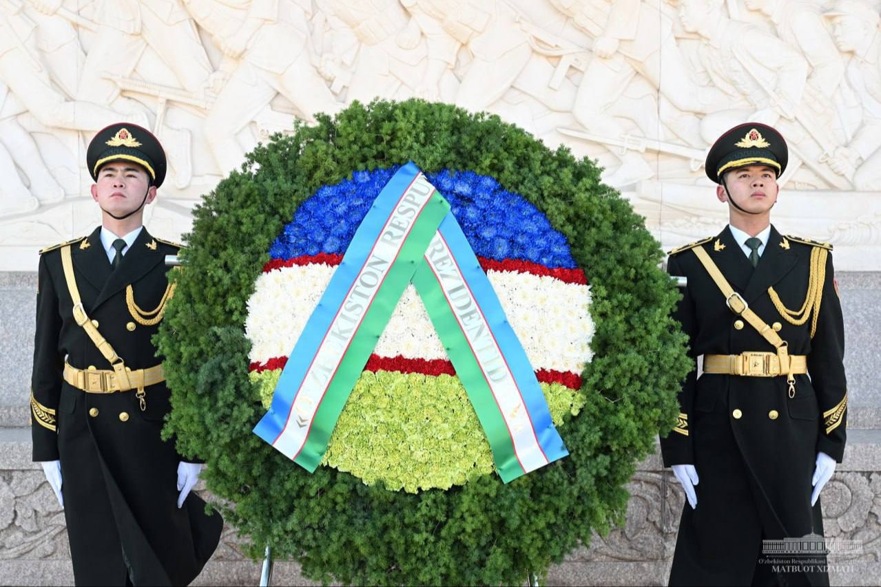 O‘zbekiston va XXR davlat madhiyalari yangradi. Davlatimiz rahbari Xalq qahramonlari yodgorligi poyiga gulchambar qo‘yib, XIX-XX asarlarda Xitoy mustaqilligi va ozodligi yo‘lida qurbon bo‘lganlarning xotirasiga hurmat bajo keltirdi.